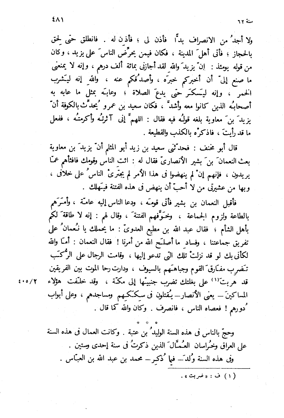 قَالَ أَبُو مخنف: فَحَدَّثَنِي سَعِيد بن زَيْد أَبُو المثلم أن يَزِيد بن مُعَاوِيَة بعث النُّعْمَان بن بشير الأنصاري فقال له: ائت الناس وقومك فافثأهم عما يريدون، فإنهم إن لم ينهضوا فِي هَذَا الأمر لم يجترئ الناس عَلَى خلافي، وبها من عشيرتي من لا أحب أن ينهض فِي هَذِهِ الْفِتْنَة فيهلك فأقبل النُّعْمَان بن بشير فأتى قومه، ودعا الناس إِلَيْهِ عامة، وأمرهم بالطاعة ولزوم الجماعة، وخوفهم الْفِتْنَة، وَقَالَ لَهُمْ: إنه لا طاقة لكم بأهل الشام، فَقَالَ عَبْد اللَّهِ بن مطيع العدوي: مَا يحملك يَا نعمان عَلَى تفريق جماعتنا، وفساد مَا أصلح اللَّه من أمرنا! فَقَالَ النُّعْمَان: أما وَاللَّهِ لكأني بك لو قَدْ نزلت تِلَكَ الَّتِي تدعو إِلَيْهَا، وقامت الرجال عَلَى الركب تضرب مفارق القوم وجباههم بالسيوف، ودارت رحا الموت بين الفريقين قَدْ هربت عَلَى بغلتك تضرب جنبيها إِلَى مكة، وَقَدْ خلفت هَؤُلاءِ المساكين- يعني الأنصار- يقتلون فِي سككهم ومساجدهم، وعلى أبواب دورهم! فعصاه الناس، فانصرف وَكَانَ وَاللَّهِ كما قَالَ.