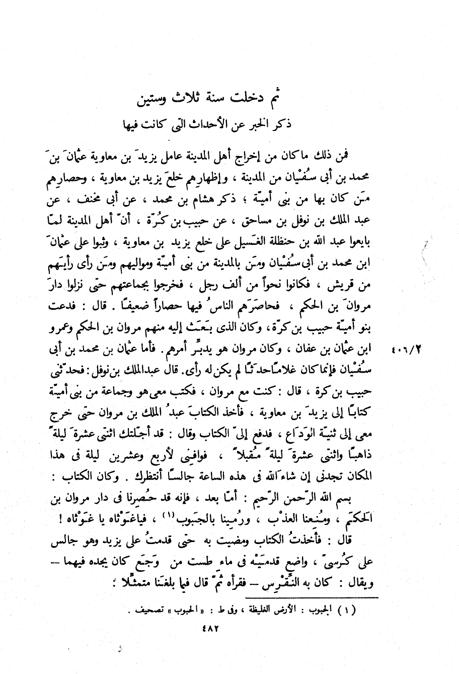 (ذكر الخبر عن الأحداث الَّتِي كَانَتْ فِيهَا) فمن ذَلِكَ مَا كَانَ من إخراج أهل الْمَدِينَة عامل يَزِيد بن مُعَاوِيَة عُثْمَان بن مُحَمَّدِ بْنِ أَبِي سُفْيَانَ مِنَ الْمَدِينَةِ، وإظهارهم خلع يَزِيد بن مُعَاوِيَة، وحصارهم من كَانَ بِهَا من بني أُمَيَّة، ذكر هِشَام بن مُحَمَّدٍ، عن أبي مخنف، عن عبد الملك بن نوفل بن مساحق، عن حبيب بن كرة، أن أهل الْمَدِينَة لما بايعوا عَبْد اللَّهِ بن حنظلة الغسيل عَلَى خلع يَزِيد بن مُعَاوِيَة، وثبوا على عثمان ابن مُحَمَّدِ بْنِ أَبِي سُفْيَانَ ومن بِالْمَدِينَةِ من بنى اميه ومواليهم ومن رَأَى رأيهم من قريش، فكانوا نحوا من الف رجل، فخرجوا بجماعتهم حَتَّى نزلوا دار مَرْوَان بن الحكم، فحاصرهم الناس فِيهَا حصارا ضعيفا قَالَ: فدعت بنو أُمَيَّة حبيب بن كرة، وَكَانَ الَّذِي بعث إِلَيْهِ مِنْهُمْ مَرْوَان بن الحكم وعمرو ابن عُثْمَانَ بن عَفَّانَ، وَكَانَ مَرْوَان هُوَ يدبر أمرهم فأما عُثْمَان بن مُحَمَّدِ بْنِ أَبِي سُفْيَانَ فإنما كَانَ غلاما حدثا لَمْ يَكُنْ لَهُ رأي قَالَ عَبْد الْمَلِكِ بن نوفل: فَحَدَّثَنِي حبيب بن كرة، قَالَ: كنت مع مَرْوَان، فكتب معي هُوَ وجماعة من بني أُمَيَّة كتابا إِلَى يَزِيد بن مُعَاوِيَة، فأخذ الكتاب عَبْد الْمَلِكِ بن مَرْوَان حَتَّى خرج معي إِلَى ثنية الوداع، فدفع إلي الكتاب وَقَالَ: قَدْ أجلتك اثنتي عشرة ليلة ذاهبا واثنتي عشرة ليلة مقبلا، فوافني لأربع وعشرين ليلة فِي هَذَا المكان تجدني إِنْ شَاءَ اللَّهُ فِي هَذِهِ الساعة جالسا أنتظرك وَكَانَ الكتاب: