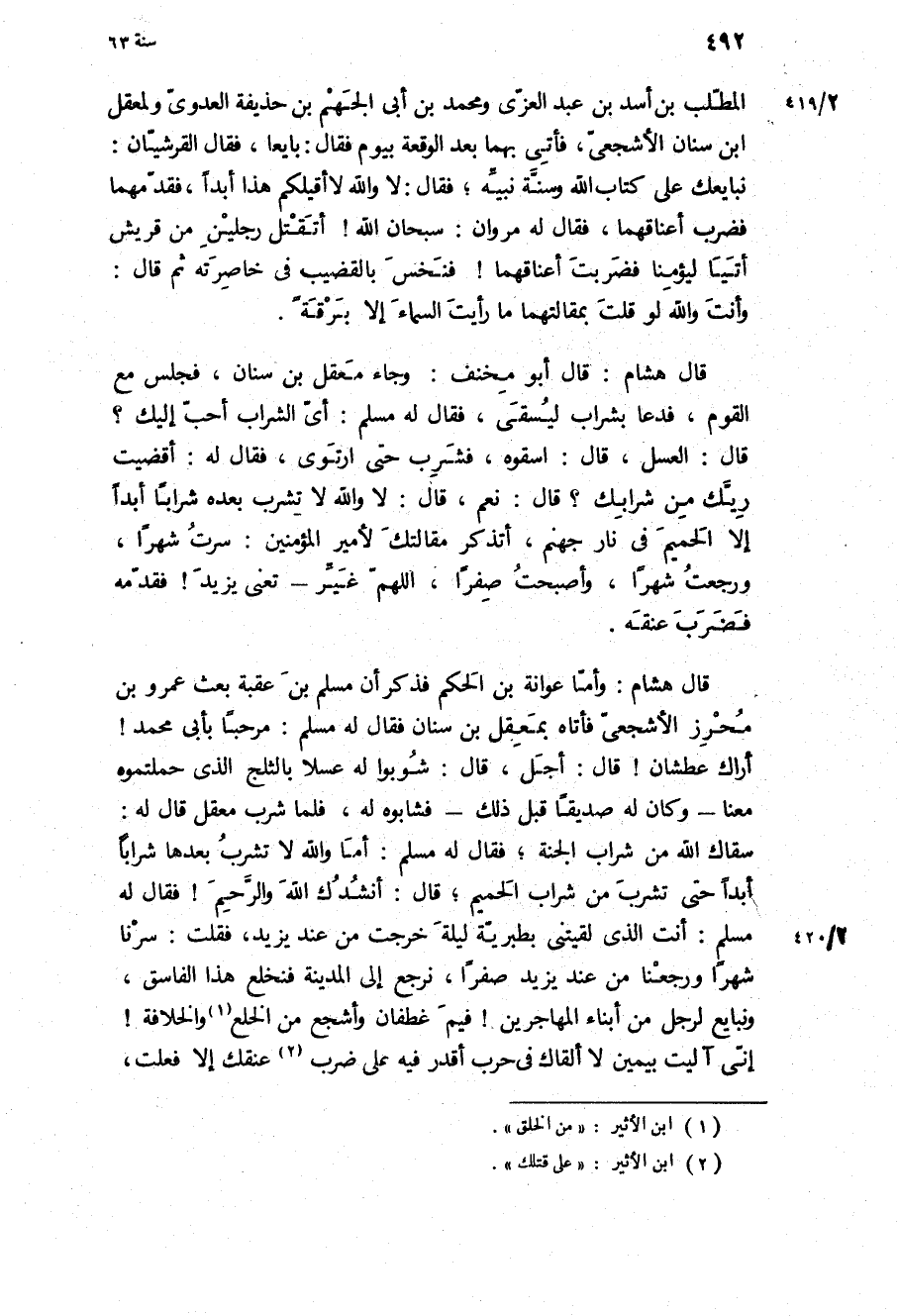 سقاك اللَّه من شراب الجنة، فَقَالَ لَهُ مسلم: أما وَاللَّهِ لا تشرب بعدها شرابا أبدا حَتَّى تشرب من شراب الحميم، قال: أنشدك الله والرحيم! فَقَالَ لَهُ مسلم: أنت الَّذِي لقيتني بطبرية ليلة خرجت من عِنْدَ يَزِيد، فقلت: سرنا شهرا ورجعنا من عِنْدَ يَزِيد صفرا، نرجع إِلَى الْمَدِينَة فنخلع هَذَا الفاسق، ونبايع لرجل من أبناء المهاجرين! فيم غطفان وأشجع من الخلع والخلافة! إني آليت بيمين لا ألقاك فِي حرب أقدر فِيهِ عَلَى ضرب عنقك إلا فعلت،