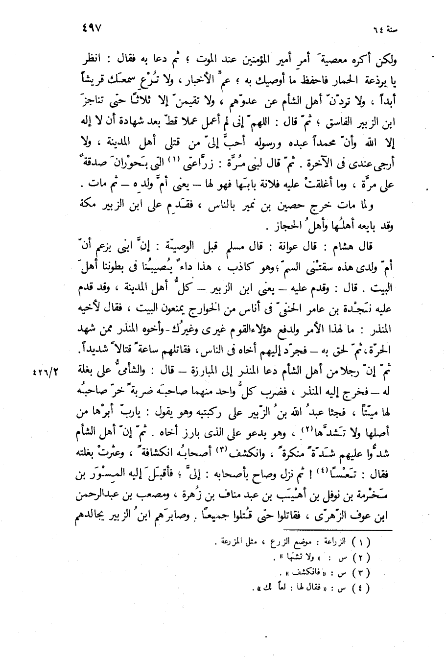 ولكن أكره معصية أمر أَمِير الْمُؤْمِنِينَ عِنْدَ الموت، ثُمَّ دعا بِهِ فَقَالَ: انظر يَا برذعة الحمار فاحفظ مَا أوصيك بِهِ، عم الأخبار، وَلا ترع سمعك قريشا أبدا، وَلا تردن أهل الشام، عن عدوهم، وَلا تقيمن إلا ثلاثا حَتَّى تناجز ابن الزُّبَيْر الفاسق، ثُمَّ قَالَ: اللَّهُمَّ إني لم أعمل عملا قط بعد شِهَادَةِ أَنْ لَا إِلَهَ إِلَّا اللَّهُ وَأَنَّ مُحَمَّدًا عبده ورسوله أحب إلي من قتلي أهل الْمَدِينَة، وَلا أرجي عندي فِي الآخرة ثُمَّ قَالَ لبني مرة: زراعتي الَّتِي بحوران صدقة عَلَى مرة، وما أغلقت عَلَيْهِ فلانة بابها فهو لها- يعني أم ولده- ثُمَّ مات.
