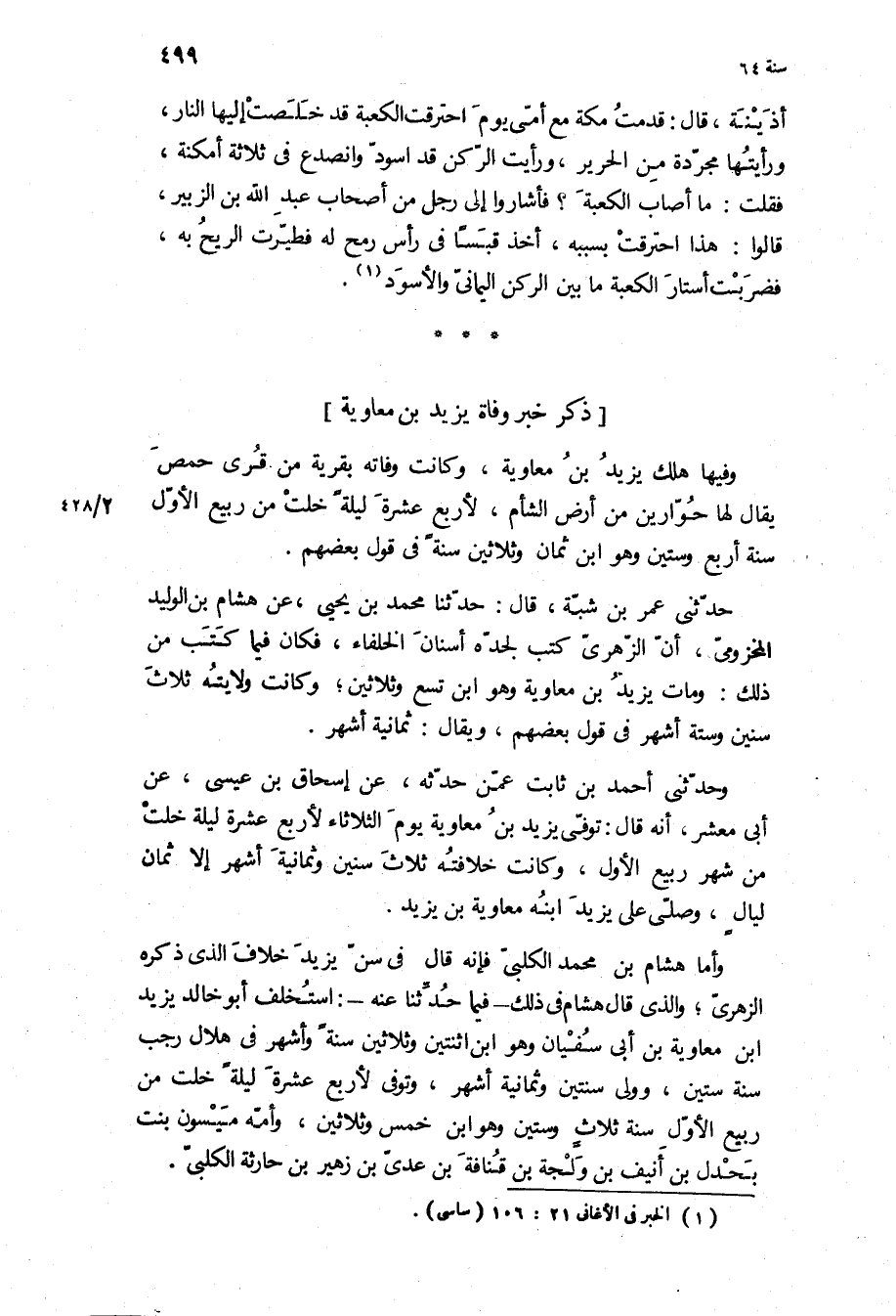 حَدَّثَنِي عُمَرُ بْنُ شَبَّةَ، قَالَ: حَدَّثَنَا مُحَمَّد بن يَحْيَى، عن هِشَام بن الْوَلِيد المخزومي، أن الزُّهْرِيّ، كتب لجده أسنان الخلفاء، فكان فِيمَا كتب من ذَلِكَ: ومات يَزِيد بن مُعَاوِيَة وَهُوَ ابن تسع وثلاثين، وكانت ولايته ثلاث سنين وستة أشهر فِي قول بعضهم، ويقال: ثمانية أشهر.