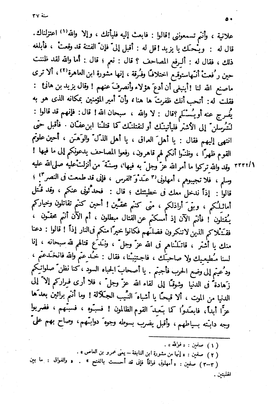 قَالَ لَهُ: ويحك يَا يَزِيد! قل لَهُ: أقبل إلي فإن الْفِتْنَة قَدْ وقعت، فأبلغه ذَلِكَ، فَقَالَ لَهُ: ألرفع المصاحف؟ قَالَ: نعم، قَالَ: أما وَاللَّهِ لقد ظننت حين رفعت أنها ستوقع اختلافا وفرقة، إنها مشورة ابن العاهرة، أَلا ترى مَا صنع اللَّه لنا! أينبغي أن أدع هَؤُلاءِ وأنصرف عَنْهُمْ! وَقَالَ يَزِيد بن هانئ: