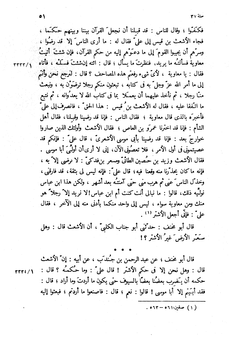 فكفوا، وَقَالَ لِلنَّاسِ: قَدْ قبلنا أن نجعل القرآن بيننا وبينهم حكما،] فَجَاءَ الأشعث بن قيس إِلَى علي فَقَالَ لَهُ: مَا أَرَى الناس إلا قَدْ رضوا، وسرهم أن يجيبوا القوم إِلَى مَا دعوهم إِلَيْهِ من حكم القرآن، فإن شئت أتيت مُعَاوِيَة فسألته مَا يريد، فنظرت مَا يسأل، قَالَ: ائته إن شئت فسله، فأتاه فَقَالَ: يَا مُعَاوِيَة، لأي شَيْء رفعتم هَذِهِ المصاحف؟ قَالَ: لنرجع نحن وَأَنْتُمْ إِلَى مَا أمر اللَّه عَزَّ وَجَلَّ بِهِ فِي كتابه، تبعثون مِنْكُمْ رجلا ترضون بِهِ، ونبعث منا رجلا، ثُمَّ نأخذ عليهما أن يعملا بِمَا فِي كتاب اللَّه لا يعدوانه، ثُمَّ نتبع مَا اتفقا عَلَيْهِ، فَقَالَ لَهُ الأشعث بن قيس: هَذَا الحق، فانصرف إِلَى علي فأخبره بِالَّذِي قَالَ مُعَاوِيَة، فَقَالَ الناس: فإنا قَدْ رضينا وقبلنا، فَقَالَ أهل الشام: فإنا قَدِ اخترنا عَمْرو بن الْعَاصِ، فقال الاشعث وأولئك الَّذِينَ صاروا خوارج بعد: فإنا قَدْ رضينا بأبي مُوسَى الأَشْعَرِيّ، [قَالَ علي: فإنكم قَدْ عصيتموني فِي أول الأمر، فلا تعصوني الآن، إني لا أَرَى أن أولي أبا مُوسَى] .