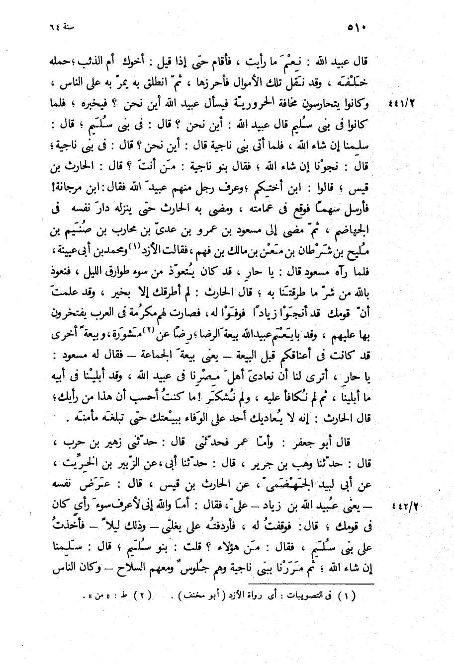 قَالَ أَبُو جَعْفَر: وأما عمر فَحَدَّثَنِي قَالَ: حَدَّثَنِي زهير بن حرب، قَالَ: حَدَّثَنَا وَهْبُ بْنُ جَرِيرٍ، قَالَ: حَدَّثَنَا أبي، عن الزُّبَيْر بن الخريت، عن أبي لبيد الجهضمي، عن الْحَارِث بن قيس، قَالَ: عرض نفسه- يعني عُبَيْد اللَّهِ بن زياد- علي، فَقَالَ: أما وَاللَّهِ إني لأعرف سوء رأي كَانَ فِي قومك، قال: فوقفت لَهُ، فأردفته عَلَى بغلتي- وَذَلِكَ ليلا- فأخذت عَلَى بني سليم، فَقَالَ: من هَؤُلاءِ؟ قلت: بنو سليم، قَالَ: سلمنا إِنْ شَاءَ اللَّهُ، ثُمَّ مررنا ببني ناجية وهم جلوس ومعهم السلاح- وَكَانَ الناس