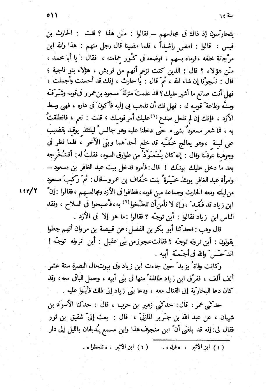 يتحارسون إذ ذاك فِي مجالسهم- فَقَالُوا: من هَذَا؟ قلت: الْحَارِث بن قيس، قَالُوا: امض راشدا، فلما مضينا قَالَ رجل مِنْهُمْ: هَذَا وَاللَّهِ ابن مرجانة خلفه، فرماه بسهم، فوضعه فِي كور عمامته، فَقَالَ: يَا أَبَا مُحَمَّد، من هَؤُلاءِ؟ قَالَ: الَّذِينَ كنت تزعم أَنَّهُمْ من قريش، هَؤُلاءِ بنو ناجية، قَالَ: نجونا إِنْ شَاءَ اللَّهُ، ثُمَّ قَالَ: يَا حارث، إنك قَدْ أحسنت وأجملت، فهل أنت صانع ما أشير عَلَيْك؟ قَدْ علمت منزلة مسعود بن عَمْرو فِي قومه وشرفه وسنه وطاعة قومه لَهُ، فهل لك أن تذهب بي إِلَيْهِ فأكون فِي داره، فهي وسط الأزد، فإنك إن لم تفعل صدع عَلَيْك أمر قومك، قلت: نعم، فانطلقت بِهِ، فما شعر مسعود بشيء حَتَّى دخلنا عَلَيْهِ وَهُوَ جالس ليلتئذ يوقد بقضيب عَلَى لبنة، وَهُوَ يعالج خفيه قَدْ خلع أحدهما وبقي الآخر، فلما نظر فِي وجوهنا عرفنا وَقَالَ: إنه كَانَ يتعوذ من طوارق السوء، فقلت لَهُ: أفتخرجه بعد ما دخل عَلَيْك بيتك! قَالَ: فأمره فدخل بيت عبد الغافر بن مسعود- وامرأة عبد الغافر يَوْمَئِذٍ خيرة بنت خفاف بن عَمْرو- قَالَ: ثُمَّ ركب مسعود من ليلته وَمَعَهُ الْحَارِث وجماعة من قومه، فطافوا فِي الأزد ومجالسهم، فَقَالُوا: إن ابن زياد قَدْ فقد، وإنا لا نأمن أن تلطخوا بِهِ، فأصبحوا فِي السلاح، وفقد الناس ابن زياد فَقَالُوا: أين توجه؟ فَقَالُوا: مَا هُوَ إلا فِي الأزد.