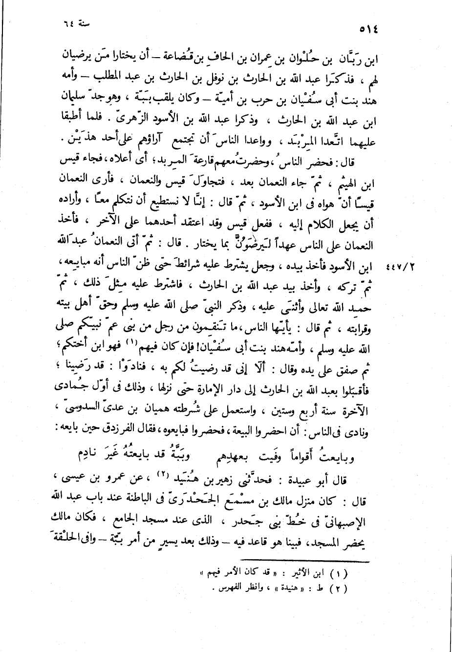 ابن ربان بن حلوان بن عِمْرَان بن الحاف بن قضاعة- أن يختارا من يرضيان لَهُمْ، فذكرا عَبْدِ اللَّهِ بْنِ الْحَارِثِ بْنِ نَوْفَلِ بْنِ الْحَارِث بْن عبد المطلب- وأمه هند بنت أبي سُفْيَان بن حرب بن أُمَيَّة- وكان يلقب ببه، وهو جد سليمان ابن عَبْدِ اللَّهِ بْنِ الْحَارِث، وذكرا عَبْد اللَّهِ بن الأَسْوَدِ الزُّهْرِيّ فلما أطبقا عليهما اتعدا المربد، وواعدا الناس أن تجتمع آراؤهم عَلَى أحد هَذَيْنِ.