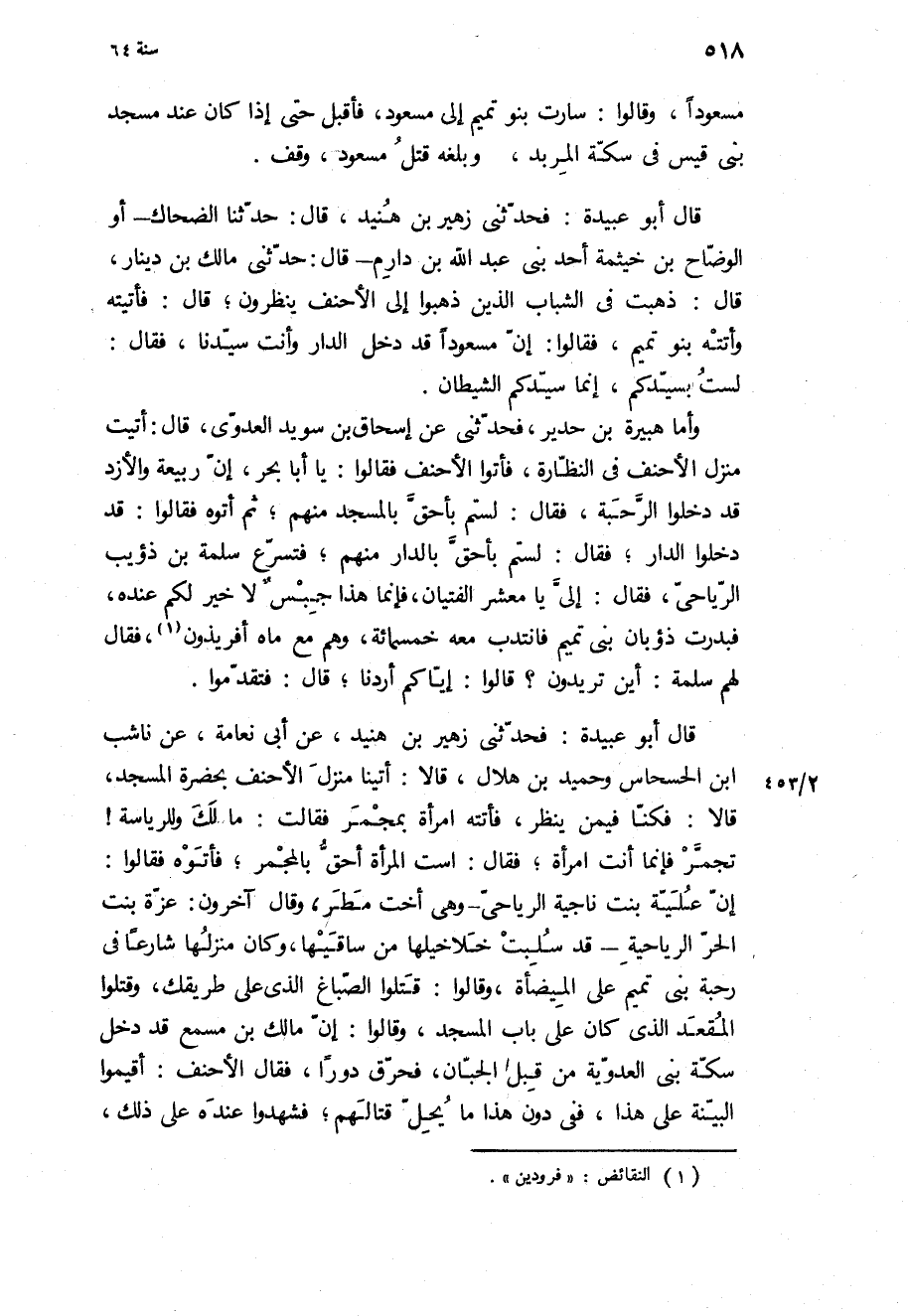 قَالَ أَبُو عبيدة: فَحَدَّثَنِي زهير بن هنيد، قَالَ: حَدَّثَنَا الضحاك- أو الوضاح بن خيثمة أحد بني عَبْد اللَّهِ بن دارم- قَالَ: حَدَّثَنِي مالك بن دينار، قَالَ: ذهبت فِي الشباب الَّذِينَ ذهبوا إِلَى الأحنف ينظرون، قَالَ: فأتيته وأتته بنو تميم، فَقَالُوا: إن مسعودا قَدْ دخل الدار وأنت سيدنا، فَقَالَ: