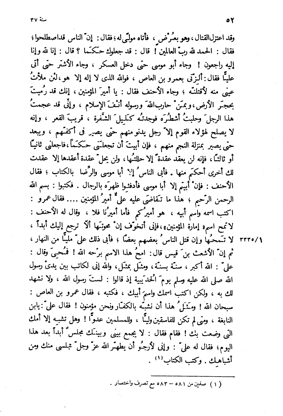 وَقَدِ اعتزل القتال، وَهُوَ بعرض، فأتاه مولى لَهُ، فَقَالَ: إن الناس قَدِ اصطلحوا، فَقَالَ: الحمد لِلَّهِ رب العالمين! قَالَ: قَدْ جعلوك حكما؟ قَالَ: إِنَّا لِلَّهِ وَإِنَّا إِلَيْهِ راجِعُونَ! وجاء أَبُو مُوسَى حَتَّى دخل العسكر، وجاء الأَشْتَر حَتَّى أتى عَلِيًّا فَقَالَ: ألزني بعمرو بن العاص، فو الله الَّذِي لا إله إلا هُوَ، لَئِنْ ملأت عيني مِنْهُ لأقتلنه، وجاء الأحنف فَقَالَ: يَا أَمِيرَ الْمُؤْمِنِينَ، إنك قَدْ رميت بحجر الأرض، وبمن حارب اللَّه ورسوله أنف الإِسْلام، وإني قَدْ عجمت هَذَا الرجل وحلبت أشطره فوجدته كليل الشفرة، قريب القعر، وإنه لا يصلح لهؤلاء القوم إلا رجل يدنو مِنْهُمْ حَتَّى يصير فِي أكفهم، ويبعد حَتَّى يصير بمنزلة النجم مِنْهُمْ، فإن أبيت أن تجعلني حكما، فاجعلني ثانيا أو ثالثا، فإنه لن يعقد عقدة إلا حللتها، ولن يحل عقدة أعقدها إلا عقدت لك أخرى أحكم منها [فأبى الناس إلا أبا مُوسَى والرضا بالكتاب، فَقَالَ الأحنف: فإن أبيتم إلا أبا مُوسَى فأدفئوا ظهره بالرجال فكتبوا: بِسْمِ اللَّهِ الرَّحْمَنِ الرَّحِيمِ، هذا ما تقاضى عَلَيْهِ علي أَمِير الْمُؤْمِنِينَ فَقَالَ عَمْرو: