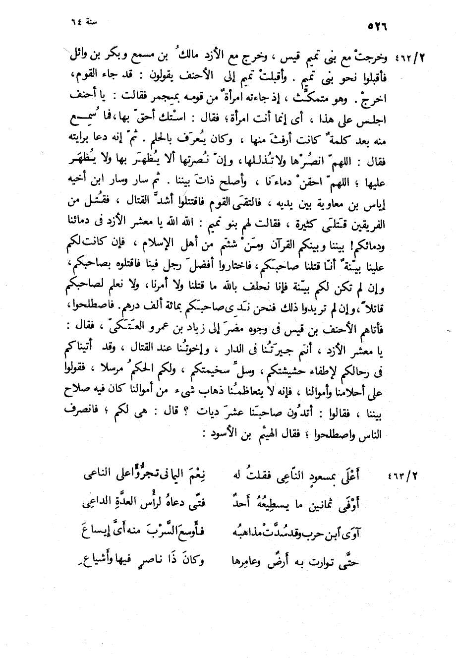 وخرجت مع بني تميم قيس، وخرج مع الأزد مالك بن مسمع وبكر بن وائل فأقبلوا نحو بني تميم وأقبلت تميم إِلَى الأحنف يقولون: قَدْ جَاءَ القوم، اخرج وَهُوَ متمكث، إذ جاءته امرأة من قومه بمجمر فَقَالَتْ: يَا أحنف اجلس عَلَى هَذَا، أي إنما أنت امرأة، فَقَالَ: استك أحق بِهَا، فما سمع منه بعد كلمه كانت رافث منها، وَكَانَ يعرف بالحلم ثُمَّ إنه دعا برايته فَقَالَ: اللَّهُمَّ انصرها وَلا تذللها، وإن نصرتها أَلا يظهر بِهَا وَلا يظهر عَلَيْهَا، اللَّهُمَّ احقن دماءنا، وأصلح ذات بيننا ثُمَّ سار وسار ابن أخيه إياس بن مُعَاوِيَة بين يديه، فالتقى القوم فاقتتلوا أشد القتال، فقتل من الفريقين قتلى كثيرة، فَقَالَتْ لَهُمْ بنو تميم: اللَّه اللَّه يَا معشر الأزد فِي دمائنا ودمائكم! بيننا وبينكم القرآن ومن شئتم من أهل الإِسْلام، فإن كَانَتْ لكم علينا بينة أنا قتلنا صاحبكم، فاختاروا أفضل رجل فينا فاقتلوه بصاحبكم، وإن لم تكن لكم بينه فانا نحلف بِاللَّهِ مَا قتلنا وَلا أمرنا، وَلا نعلم لصاحبكم قاتلا، وإن لم تريدوا ذَلِكَ فنحن ندي صاحبكم بمائة ألف درهم فاصطلحوا، فأتاهم الأحنف بن قيس فِي وجوه مضر إِلَى زياد بن عَمْرو العتكي، فَقَالَ: