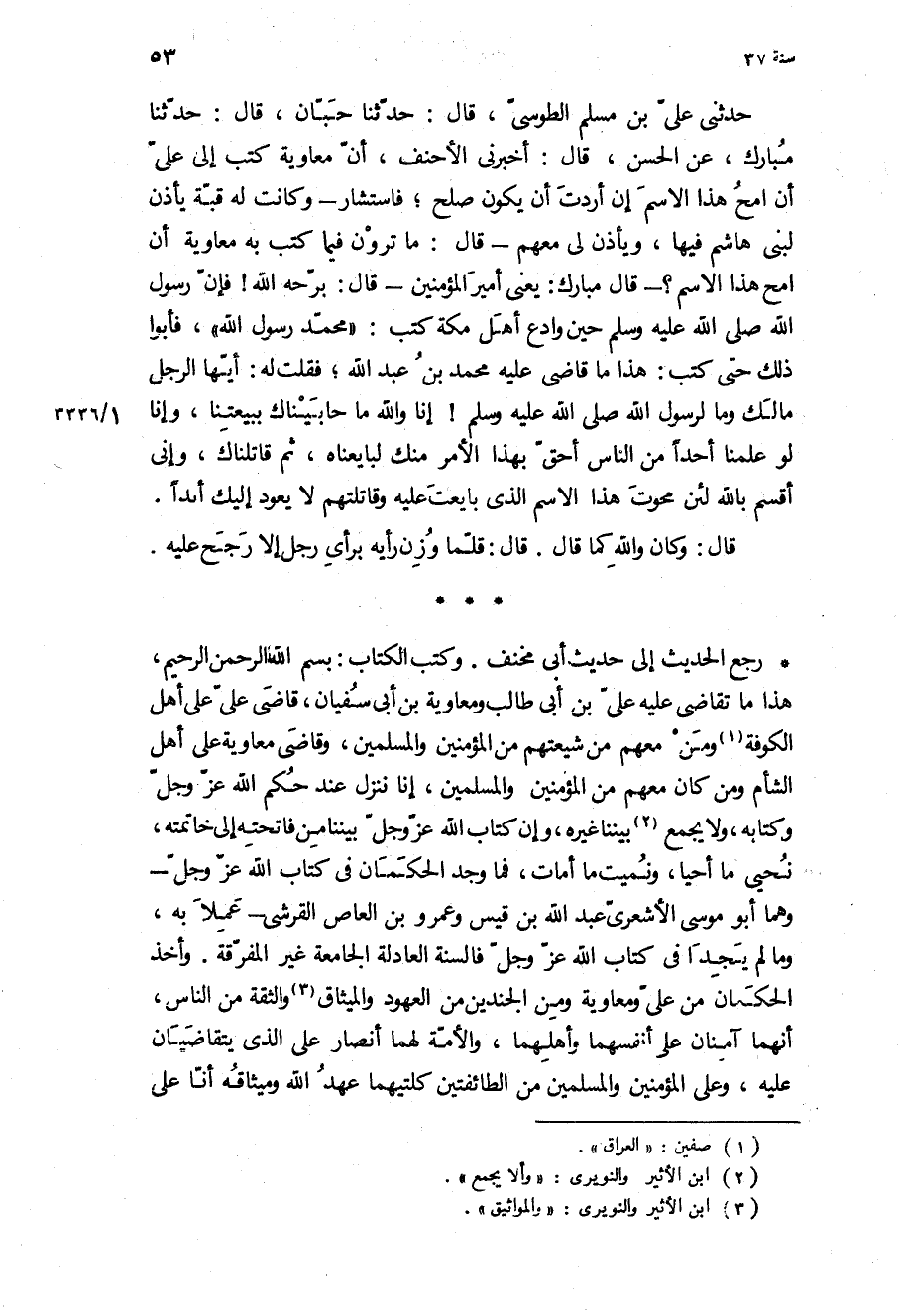حَدَّثَنِي عَلِيُّ بْنُ مُسْلِمٍ الطُّوسِيُّ، قَالَ: حَدَّثَنَا حِبَّانُ، قَالَ: حَدَّثَنَا مُبَارَكٌ، عَنِ الْحَسَنِ، قَالَ: أَخْبَرَنِي الأَحْنَفُ، أَنَّ مُعَاوِيَةَ كَتَبَ إِلَى عَلِيٍّ أَنِ امْحُ هَذَا الاسْمَ إِنْ أَرَدْتَ أَنْ يكون صلح، فَاسْتَشَارَ- وَكَانَتْ لَهُ قُبَّةٌ يَأْذَنُ لِبَنِي هَاشِمٍ فِيهَا، وَيَأْذَنُ لِي مَعَهُمْ- قَالَ: مَا تَرَوْنَ فِيمَا كَتَبَ بِهِ مُعَاوِيَةُ أَنِ امْحُ هَذَا الاسم؟ - قال مبارك: يعنى امير المؤمنين-[قال: برحه الله! فان رسول الله ص حِينَ وَادَعَ أَهْلَ مَكَّةَ كَتَبَ: مُحَمَّدٌ رَسُولُ اللَّهِ، فَأَبَوْا ذَلِكَ حَتَّى كَتَبَ: هَذَا مَا قَاضَى عَلَيْهِ مُحَمَّدُ بْنُ عَبْدِ اللَّهِ، فَقُلْتُ له: ايها الرجل مالك وما لرسول الله ص! إِنَّا وَاللَّهِ مَا حَابَيْنَاكَ بِبَيْعَتِنَا، وَإِنَّا لَوْ عَلِمْنَا أَحَدًا مِنَ النَّاسِ أَحَقَّ بِهَذَا الأَمْرِ مِنْكَ لَبَايَعْنَاهُ، ثُمَّ قَاتَلْنَاكَ، وَإِنِّي أُقْسِمُ بِاللَّهِ لَئِنْ مَحَوْتَ هَذَا الاسْمَ الَّذِي بَايَعْتَ عَلَيْهِ وَقَاتَلْتَهُمْ لا يَعُودُ إِلَيْكَ أَبَدًا.