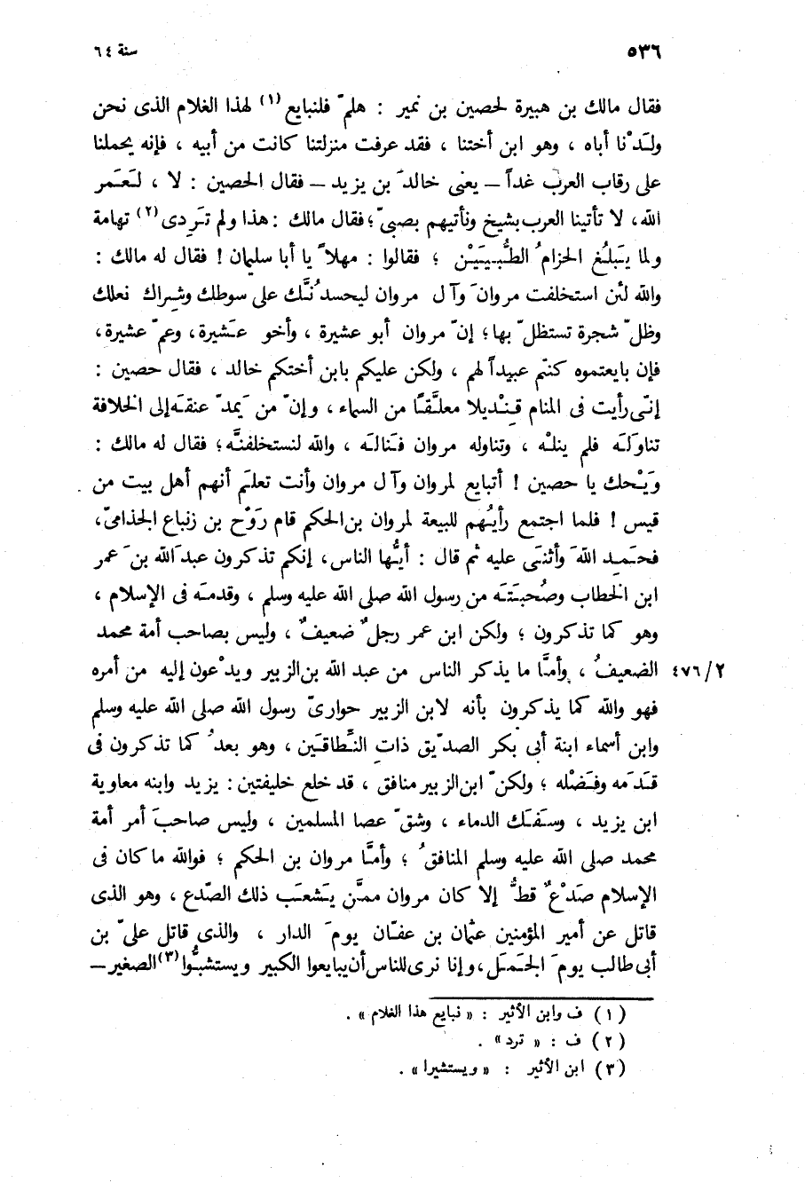فَقَالَ مالك بن هبيرة لحصين بن نمير: هلم فلنبايع لهذا الغلام الَّذِي نحن ولدنا أباه، وَهُوَ ابن أختنا، فقد عرفت منزلتنا كَانَتْ من أَبِيهِ، فإنه يحملنا عَلَى رقاب العرب غدا- يعني خَالِد بن يَزِيدَ- فَقَالَ الحصين: لا، لعمر اللَّه، لا تأتينا العرب بشيخ ونأتيهم بصبي، فَقَالَ مالك: هَذَا ولم تردى تهامه ولما يبلغ الحزام الطبيين، فَقَالُوا: مهلا يَا أَبَا سُلَيْمَان! فَقَالَ لَهُ مالك:
