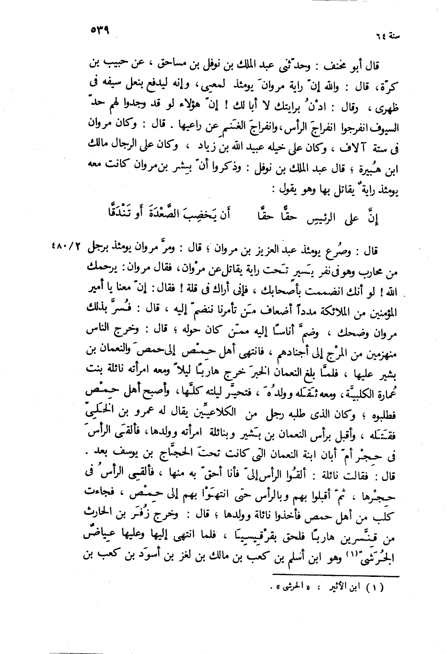 قَالَ: وصرع يَوْمَئِذٍ عَبْد الْعَزِيزِ بن مَرْوَان، قَالَ: ومر مَرْوَان يَوْمَئِذٍ برجل من محارب وَهُوَ فِي نفر يسير تحت راية يقاتل عن مَرْوَان، فَقَالَ مَرْوَان: يرحمك اللَّه! لو أنك انضممت بأَصْحَابك، فإني أراك فِي قلة! فَقَالَ: إن معنا يَا أَمِيرَ الْمُؤْمِنِينَ من الملائكة مددا أضعاف من تأمرنا ننضم إِلَيْهِ، قَالَ: فسر بِذَلِكَ مَرْوَان وضحك، وضم أناسا إِلَيْهِ ممن كَانَ حوله، قَالَ: وخرج الناس منهزمين من المرج إِلَى أجنادهم، فانتهى أهل حمص إِلَى حمص والنعمان بن بشير عَلَيْهَا، فلما بلغ النُّعْمَان الخبر خرج هاربا ليلا وَمَعَهُ امرأته نائلة بنت عمارة الكلبية، وَمَعَهُ ثقله وولده، فتحير ليلته كلها، وأصبح أهل حمص فطلبوه، وَكَانَ الَّذِي طلبه رجل من الكلاعيين يقال لَهُ عَمْرو بن الخلي فقتله، وأقبل برأس النُّعْمَان بن بشير وبنائلة امرأته وولدها، فألقى الرأس فِي حجر أم أبان ابنة النُّعْمَان الَّتِي كَانَتْ تحت الحجاج بن يُوسُفَ بعد.