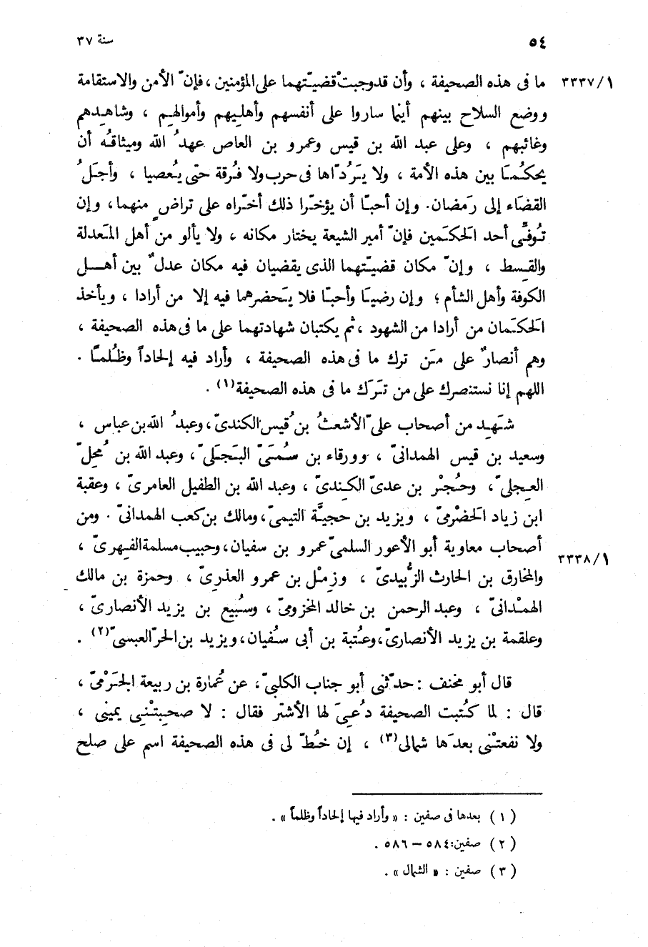 مَا فِي هَذِهِ الصحيفة، وأن قَدْ وجبت قضيتهما على المؤمنين، فان الا من والاستقامة ووضع السلاح بينهم أينما ساروا عَلَى أنفسهم وأهليهم وأموالهم، وشاهدهم وغائبهم، وعلى عَبْد اللَّهِ بن قيس وعمرو بن الْعَاصِ عهد اللَّه وميثاقه أن يحكما بين هَذِهِ الأمة، وَلا يرداها فِي حرب وَلا فرقة حَتَّى يعصيا، وأجل القضاء إِلَى رمضان وإن أحبا أن يؤخرا ذَلِكَ أخراه عَلَى تراض منهما، وإن توفي أحد الحكمين فإن أَمِير الشيعة يختار مكانه، وَلا يألو من أهل المعدلة والقسط، وإن مكان قضيتهما الَّذِي يقضيان فِيهِ مكان عدل بين أهل الْكُوفَة وأهل الشام، وإن رضيا وأحبا فلا يحضرهما فِيهِ إلا من أرادا، ويأخذ الحكمان من أرادا من الشهود، ثُمَّ يكتبان شهادتهما عَلَى مَا فِي هَذِهِ الصحيفة،.
