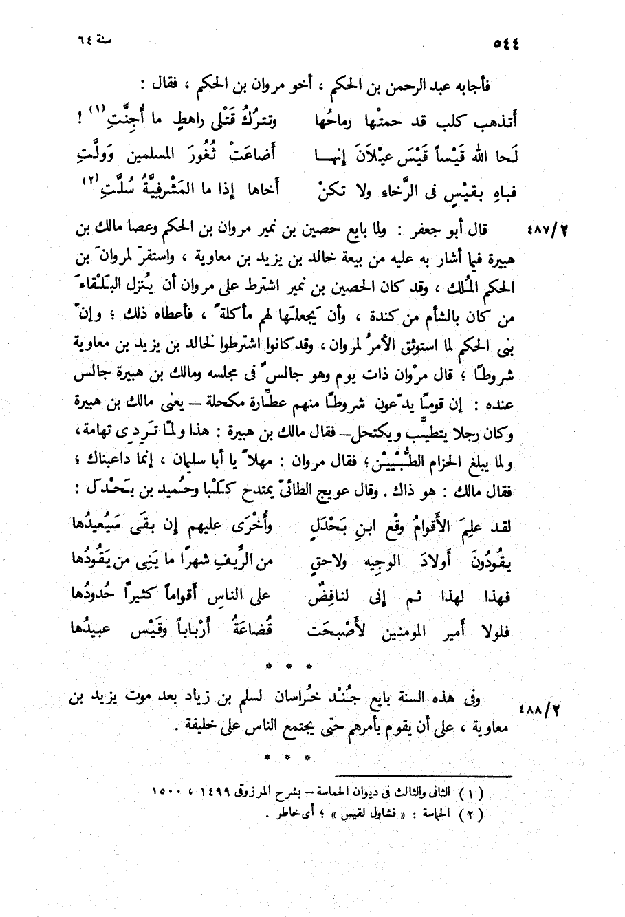 قَالَ أَبُو جَعْفَر: ولما بايع حصين بن نمير مروان بن الحكم وعصا مالك بن هبيرة فِيمَا أشار بِهِ عَلَيْهِ من بيعة خَالِد بن يَزِيدَ بن مُعَاوِيَة، واستقر لمروان بن الحكم الملك، وَقَدْ كَانَ الحصين بن نمير اشترط عَلَى مَرْوَان أن ينزل البلقاء من كَانَ بِالشَّامِ من كندة، وأن يجعلها لَهُمْ مأكلة، فأعطاه ذَلِكَ، وإن بني الحكم لما استوثق الأمر لمروان، وَقَدْ كَانُوا اشترطوا لخالد بن يَزِيدَ بن مُعَاوِيَة شروطا، قَالَ مَرْوَان ذات يوم وَهُوَ جالس فِي مجلسه ومالك بن هبيرة جالس عنده: إن قوما يدعون شروطا مِنْهُمْ عطارة مكحلة- يعني مالك بن هبيرة وَكَانَ رجلا يتطيب ويكتحل- فَقَالَ مالك بن هبيرة: هَذَا ولما تردي تهامة، ولما يبلغ الحزام الطبيين، فَقَالَ مَرْوَان: مهلا يَا أَبَا سُلَيْمَان، إنما داعبناك، فَقَالَ مالك: هُوَ ذاك وَقَالَ عويج الطَّائِيّ يمتدح كلبا وحميد بن بحدل: