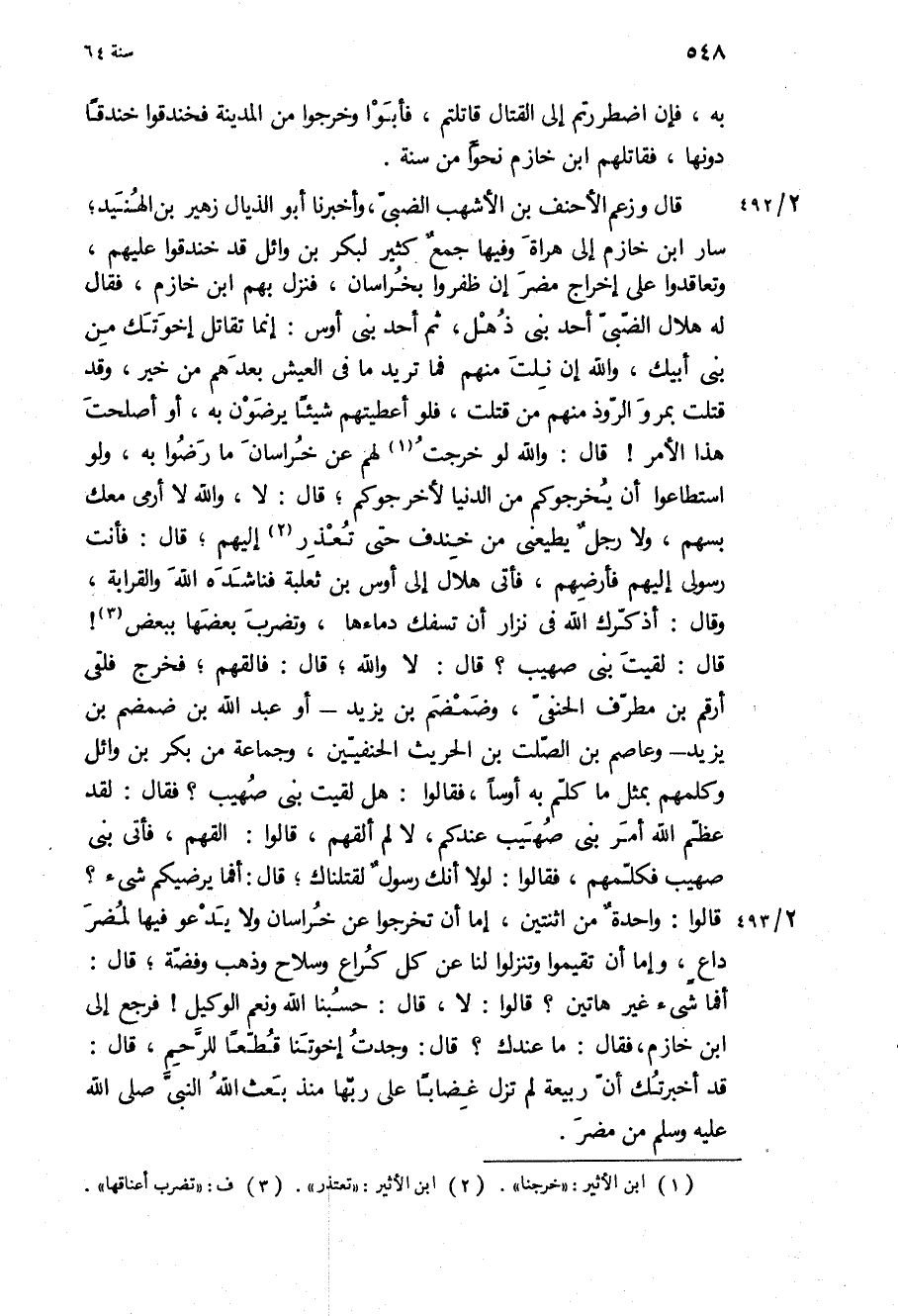 قَالَ وزعم الأحنف بن الأشهب الضبي، وأخبرنا أَبُو الذيال زهير بن الهنيد، سار ابن خازم إِلَى هراة وفيها جمع كثير لبكر بن وائل قَدْ خندقوا عَلَيْهِم، وتعاقدوا عَلَى إخراج مضر إن ظفروا بخراسان، فنزل بهم ابن خازم، فَقَالَ لَهُ هلال الضبي أحد بني ذهل، ثُمَّ أحد بني أوس: إنما تقاتل إخوتك من بني أبيك، وَاللَّهِ إن نلت مِنْهُمْ فما تريد مَا فِي العيش بعدهم من خير، وَقَدْ قتلت بمرو الروذ مِنْهُمْ من قتلت، فلو أعطيتهم شَيْئًا يرضون بِهِ، أو أصلحت هَذَا الأمر! قَالَ: وَاللَّهِ لو خرجت لَهُمْ عن خُرَاسَان مَا رضوا بِهِ، ولو استطاعوا أن يخرجوكم من الدُّنْيَا لأخرجوكم، قَالَ لا، وَاللَّهِ لا أرمي معك بسهم، وَلا رجل يطيعني من خندف حَتَّى تعذر إِلَيْهِم، قَالَ: فأنت رسولي إِلَيْهِم فأرضهم، فأتى هلال إِلَى أوس بن ثعلبة فناشده اللَّه والقرابة، وَقَالَ: أذكرك اللَّه فِي نزار أن تسفك دماءها، وتضرب بعضها ببعض! قَالَ: لقيت بني صهيب؟ قَالَ: لا وَاللَّهِ، قَالَ: فالقهم، فخرج فلقي أرقم بن مطرف الحنفي، وضمضم بن يَزِيدَ- أو عَبْد اللَّهِ بن ضمضم بن يَزِيدَ- وعاصم بن الصلت بن الحريث الحنفيين، وجماعة من بكر بن وائل وكلمهم بمثل مَا كلم بِهِ أوسا، فَقَالُوا: هل لقيت بني صهيب؟ فَقَالَ: لقد عظم اللَّه أمر بني صهيب عندكم، لا لم ألقهم، قَالُوا: القهم، فأتى بني صهيب فكلمهم، فَقَالُوا: لولا أنك رسول لقتلناك، قَالَ: أفما يرضيكم شَيْء؟