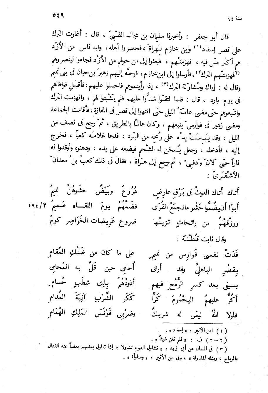 قَالَ أَبُو جَعْفَر: وأخبرنا سُلَيْمَان بن مُجَالِد الضبي، قَالَ: أغارت الترك عَلَى قصر إسفاد وابن خازم بهراة، فحصروا أهله، وفيه ناس من الأزد هم أكثر من فِيهِ، فهزمتهم، فبعثوا إِلَى من حولهم من الأزد فجاءوا لينصروهم فهزمتهم الترك، فأرسلوا إِلَى ابن خازم، فوجه إِلَيْهِم زهير بن حيان فِي بني تميم وَقَالَ لَهُ: إياك ومشاولة الترك، إذا رأيتموهم فاحملوا عَلَيْهِم، فأقبل فوافاهم فِي يوم بارد، قَالَ: فلما التقوا شدوا عَلَيْهِم فلم يثبتوا لَهُمْ، وانهزمت الترك واتبعوهم حَتَّى مضى عامة الليل حَتَّى انتهوا إِلَى قصر فِي المفازة، فأقامت الجماعة ومضى زهير فِي فوارس يتبعهم، وَكَانَ عالما بالطريق، ثُمَّ رجع فِي نصف من الليل، وَقَدْ يبست يده عَلَى رمحه من البرد، فدعا غلامه كعبا، فخرج إِلَيْهِ، فأدخله، وجعل يسخن لَهُ الشحم فيضعه عَلَى يده، ودهنوه وأوقدوا لَهُ نارا حَتَّى لان ودفى، ثُمَّ رجع إِلَى هراة، فَقَالَ فِي ذَلِكَ كعب بن مَعْدَانَ الأشقري: