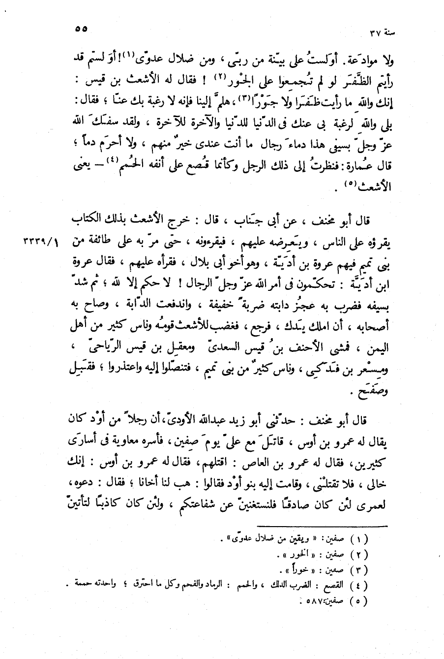 ولا موادعه او لست عَلَى بينة من ربي، ومن ضلال عدوي! او لستم قَدْ رأيتم الظفر لو لم تجمعوا عَلَى الجور! فَقَالَ لَهُ الأشعث بن قيس:
