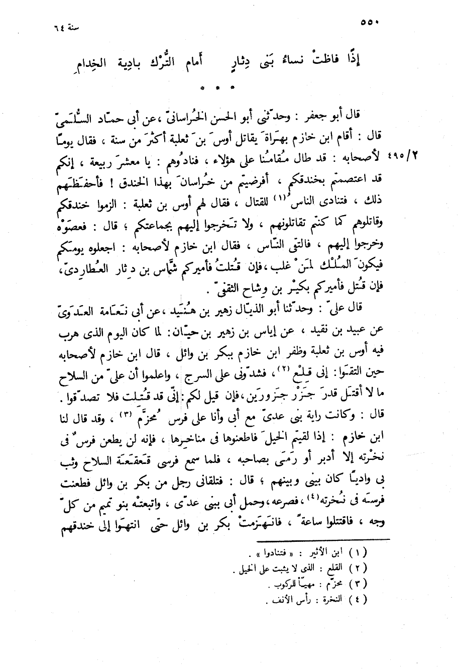 قَالَ: وكانت راية بني عدي مع أبي وأنا عَلَى فرس محزم، وَقَدْ قَالَ لنا ابن خازم: إذا لقيتم الخيل فاطعنوها فِي مناخرها، فإنه لن يطعن فرس فِي نخرته إلا أدبر أو رمى بصاحبه، فلما سمع فرسي قعقعة السلاح وثب بي واديا كَانَ بيني وبينهم، قَالَ: فتلقاني رجل من بكر بن وائل فطعنت فرسه فِي نخرته، فصرعه، وحمل أبي ببني عدي، وأتبعته بنو تميم من كل وجه، فاقتتلوا ساعة، فانهزمت بكر بن وائل حَتَّى انتهوا الى خندقهم