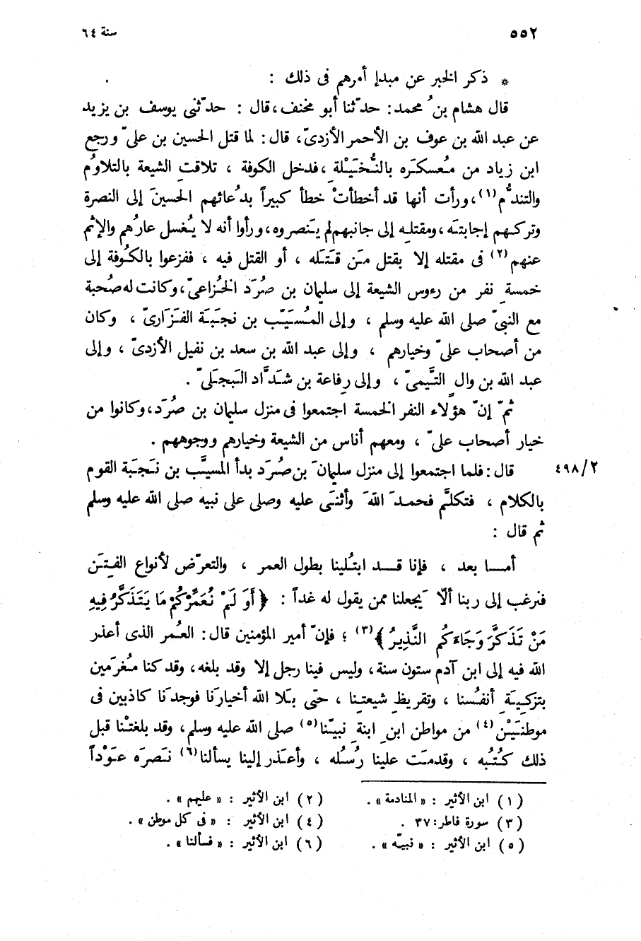 قَالَ: فلما اجتمعوا إِلَى منزل سُلَيْمَان بن صرد بدأ المسيب بن نجبة القوم بالكلام، فتكلم فَحَمِدَ اللَّهَ وَأَثْنَى عَلَيْهِ وصلى على نبيه ص ثُمَّ قَالَ: