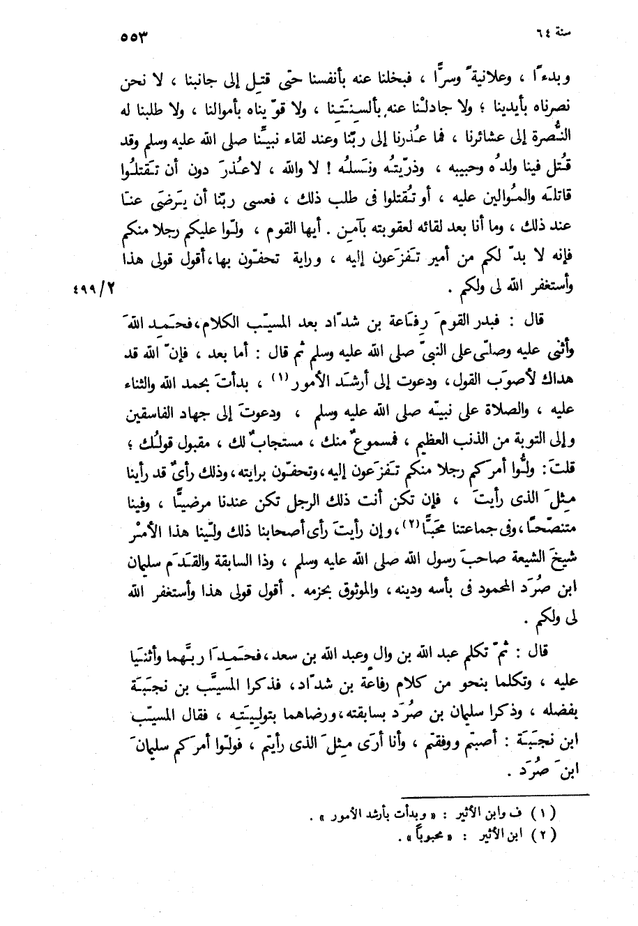 قَالَ: ثُمَّ تكلم عَبْد اللَّهِ بن وال وعبد اللَّه بن سَعْد، فحمدا ربهما وأثنيا عَلَيْهِ، وتكلما بنحو من كلام رفاعة بن شداد، فذكرا المسيب بن نجبة بفضله، وذكرا سُلَيْمَان بن صرد بسابقته، ورضاهما بتوليته، فَقَالَ المسيب ابن نجبة: أصبتم ووفقتم، وأنا أَرَى مثل الَّذِي رايتم، فولوا امركم سليمان ابن صرد