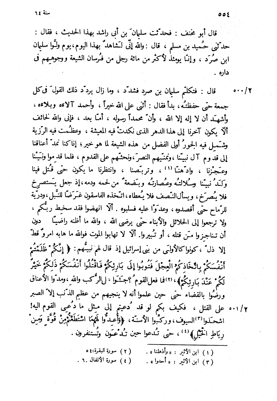 قَالَ: فتكلم سُلَيْمَان بن صرد فشدد، وما زال يردد ذَلِكَ القول فِي كل جمعة حَتَّى حفظته، بدأ فَقَالَ: أثني عَلَى اللَّه خيرا، وأحمد آلاءه وبلاءه، وأشهد أَنْ لَا إِلَهَ إِلَّا اللَّهُ، وَأَنَّ مُحَمَّدًا رسوله، أَمَّا بَعْدُ، فإني وَاللَّهِ لخائف أَلا يكون آخرنا إِلَى هَذَا الدهر الَّذِي نكدت فِيهِ المعيشة، وعظمت فِيهِ الرزية وشمل فِيهِ الجور أولي الفضل من هَذِهِ الشيعة لما هُوَ خير، أنا كنا نمد أعناقنا إِلَى قدوم آل نبينا، ونمنيهم النصر، ونحثهم عَلَى القدوم، فلما قدموا ونينا وعجزنا، وأدهنا، وتربصنا، وانتظرنا مَا يكون حتى قتل فينا ولد نبينا وسلالته وعصارته وبضعة من لحمه ودمه، إذ جعل يستصرخ فلا يصرخ، ويسأل النصف فلا يعطاه، اتخذه الفاسقون غرضا للنبل، ودرية للرماح حَتَّى أقصدوه، وعدوا عَلَيْهِ فسلبوه أَلا انهضوا فقد سخط ربكم، وَلا ترجعوا إِلَى الحلائل والأبناء حَتَّى يرضى اللَّه، وَاللَّهِ مَا أظنه راضيا دون أن تناجزوا من قتله، أو تبيروا أَلا لا تهابوا الموت فو الله مَا هابه امرؤ قط إلا ذل، كونوا كالأولى من بني إسرائيل إذ قَالَ لَهُمْ نبيهم: «إِنَّكُمْ ظَلَمْتُمْ أَنْفُسَكُمْ بِاتِّخاذِكُمُ الْعِجْلَ فَتُوبُوا إِلى بارِئِكُمْ فَاقْتُلُوا أَنْفُسَكُمْ ذلِكُمْ خَيْرٌ لَكُمْ عِنْدَ بارِئِكُمْ» ، فما فعل القوم؟ جثوا عَلَى الركب وَاللَّهِ، ومدوا الأعناق ورضوا بالقضاء حَتَّى حين علموا أنه لا ينجيهم من عظيم الذنب إلا الصبر عَلَى القتل، فكيف بكم لو قَدْ دعيتم إِلَى مثل مَا دعي القوم إِلَيْهِ! اشحذوا السيوف، وركبوا الأسنة، «وَأَعِدُّوا لَهُمْ مَا اسْتَطَعْتُمْ مِنْ قُوَّةٍ وَمِنْ رِباطِ الْخَيْلِ» ، حَتَّى تدعوا حين تدعون وتستنفرون