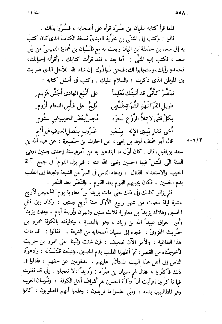 فلم يزالوا كذلك وفي ذَلِكَ حَتَّى مات يَزِيد بن مُعَاوِيَة يوم الخميس لأربع عَشْرَةَ لَيْلَةً مَضَتْ مِنْ شَهْرِ رَبِيعٍ الأَوَّلِ سنة أربع وستين، وَكَانَ بين قتل الْحُسَيْن وهلاك يَزِيد بن مُعَاوِيَة ثلاث سنين وشهران وأربعة أيام، وهلك يَزِيد وأمير العراق عُبَيْد اللَّهِ بن زياد، وَهُوَ بِالْبَصْرَةِ، وخليفته بالكوفة عَمْرو بن حريث المخزومي، فَجَاءَ إِلَى سُلَيْمَان أَصْحَابه من الشيعة، فَقَالُوا: قَدْ مات هَذَا الطاغية، والأمر الآن ضعيف، فإن شئت وثبنا عَلَى عَمْرو بن حريث فأخرجناه من القصر، ثُمَّ أظهرنا الطلب بدم الْحُسَيْن، وتتبعنا قتلته، ودعونا الناس إِلَى أهل هَذَا البيت المستأثر عَلَيْهِم، المدفوعين عن حقهم، فَقَالُوا فِي ذَلِكَ فأكثروا، فَقَالَ لَهُمْ سُلَيْمَان بن صرد: رويدا، لا تعجلوا، إني قَدْ نظرت فِيمَا تذكرون، فرأيت أن قتلة الْحُسَيْن هم أشراف أهل الْكُوفَة، وفرسان العرب وهم المطالبون بدمه، ومتى علموا مَا تريدون، وعلموا أَنَّهُمُ المطلوبون، كَانُوا