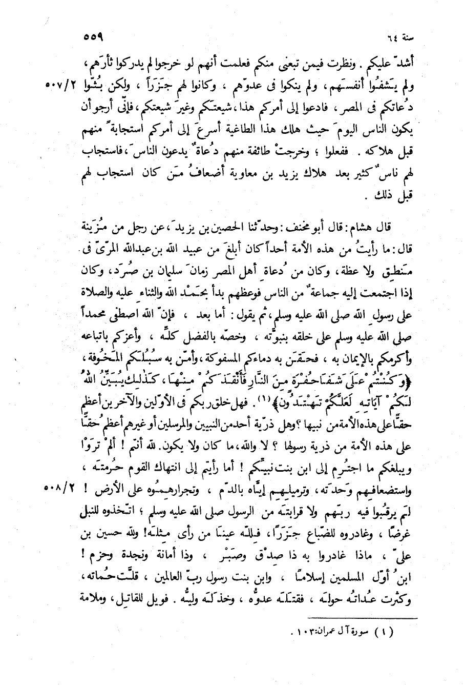 قَالَ هِشَام: قَالَ أَبُو مخنف: وَحَدَّثَنَا الحصين بن يَزِيدَ، عن رجل من مزينة قَالَ: مَا رأيت من هَذِهِ الأمة أحدا كَانَ أبلغ من عُبَيْد اللَّهِ بن عَبْدِ اللَّهِ المري فِي منطق وَلا عظة، وَكَانَ من دعاة أهل المصر زمان سُلَيْمَان بن صرد، وَكَانَ إذا اجتمعت إِلَيْهِ جماعة مِنَ النَّاسِ فوعظهم بدأ بحمد اللَّه والثناء عَلَيْهِ والصلاة عَلَى رَسُول الله ص، ثُمَّ يقول: أَمَّا بَعْدُ، فإن اللَّه اصطفى محمدا ص عَلَى خلقه بنبوته، وخصه بالفضل كله، وأعزكم بأتباعه وأكرمكم بالإيمان بِهِ، فحقن بِهِ دماءكم المسفوكة، وأمن بِهِ سبلكم المخوفة، «وَكُنْتُمْ عَلى شَفا حُفْرَةٍ مِنَ النَّارِ فَأَنْقَذَكُمْ مِنْها، كَذلِكَ يُبَيِّنُ اللَّهُ لَكُمْ آياتِهِ لَعَلَّكُمْ تَهْتَدُونَ» فهل خلق ربكم فِي الأولين والآخرين أعظم حقا عَلَى هَذِهِ الأمة من نبيها؟ وهل ذرية أحد من النبيين والمرسلين أو غيرهم أعظم حقا عَلَى هَذِهِ الأمة من ذرية رسولها؟ لا وَاللَّهِ، مَا كَانَ وَلا يكون لِلَّهِ أنتم! ألم تروا ويبلغكم مَا اجترم إِلَى ابن بنت نبيكم! أما رأيتم إِلَى انتهاك القوم حرمته، واستضعافهم وحدته، وترميلهم إِيَّاهُ بالدم، وتجرارهموه عَلَى الأرض! لم يرقبوا فِيهِ ربهم ولا قرابته من الرسول ص، اتخذوه للنبل غرضا، وغادروه للضباع جزرا، فلله عينا من رَأَى مثله! ولله حُسَيْن بن علي، ماذا غادروا بِهِ ذا صدق وصبر، وذا أمانة ونجدة وحزم! ابن أول الْمُسْلِمِينَ إسلاما، وابن بنت رسول رب العالمين، قلت حماته، وكثرت عداته حوله، فقتله عدوه، وخذله وليه فويل للقاتل، وملامة