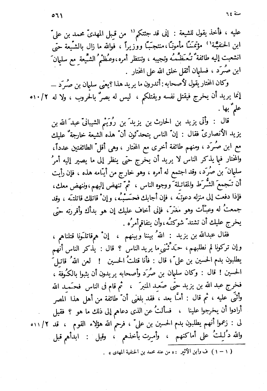 قَالَ: وأتى يَزِيد بن الْحَارِث بن يَزِيدَ بن رويم الشيباني عَبْد اللَّهِ بن يَزِيدَ الأَنْصَارِيّ فَقَالَ: إن الناس يتحدثون أن هَذِهِ الشيعة خارجة عَلَيْك مع ابن صرد، ومنهم طائفة أخرى مع المختار، وَهِيَ أقل الطائفتين عددا، والمختار فِيمَا يذكر الناس لا يريد أن يخرج حَتَّى ينظر إِلَى مَا يصير إِلَيْهِ أمر سُلَيْمَان بن صرد، وَقَدِ اجتمع لَهُ أمره، وَهُوَ خارج من أيامه هَذِهِ، فإن رأيت أن تجمع الشرط والمقاتلة ووجوه الناس، ثُمَّ تنهض إِلَيْهِم، وننهض معك، فإذا دفعت الى منزله دعوته، فان أجابك فحسبه، وإن قاتلك قاتلته، وَقَدْ جمعت لَهُ وعبأت وَهُوَ مغتر، فإني أخاف عَلَيْك إن هُوَ بدأك وأقررته حَتَّى يخرج عَلَيْك أن تشتد شوكته، وأن يتفاقم أمره.