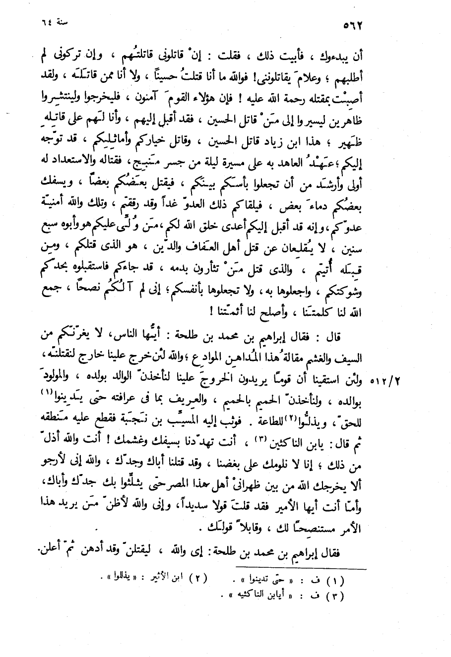 أن يبدءوك، فأبيت ذَلِكَ، فقلت: إن قاتلوني قاتلتهم، وإن تركوني لم أطلبهم، وعلام يقاتلونني! فو الله مَا أنا قتلت حسينا، وَلا أنا ممن قاتله، وَلَقَدْ أصبت بمقتله رحمة اللَّه عَلَيْهِ! فإن هَؤُلاءِ القوم آمنون، فليخرجوا ولينتشروا ظاهرين ليسيروا إِلَى من قاتل الْحُسَيْن، فقد أقبل إِلَيْهِم، وأنا لَهُمْ عَلَى قاتله ظهير، هَذَا ابن زياد قاتل الْحُسَيْن، وقاتل خياركم وأماثلكم، قَدْ توجه إليكم، عهد العاهد بِهِ عَلَى مسيرة ليلة من جسر منبج، فقتاله والاستعداد لَهُ أولى وأرشد من أن تجعلوا بأسكم بينكم، فيقتل بعضكم بعضا، ويسفك بعضكم دماء بعض، فيلقاكم ذَلِكَ العدو غدا وَقَدْ رققتم، وتلك وَاللَّهِ أمنية عدوكم، وإنه قَدْ أقبل إليكم أعدى خلق اللَّه لكم، من ولي عَلَيْكُمْ هُوَ وأبوه سبع سنين، لا يقلعان عن قتل أهل العفاف والدين، هُوَ الَّذِي قتلكم، ومن قبله اتيتم، والذي قتل من تثأرون بدمه، قَدْ جاءكم فاستقبلوه بحدكم وشوكتكم، واجعلوها بِهِ، وَلا تجعلوها بأنفسكم، إني لم آلكم نصحا، جمع اللَّه لنا كلمتنا، وأصلح لنا أئمتنا! قَالَ: فَقَالَ إِبْرَاهِيم بن مُحَمَّدِ بْنِ طَلْحَة: أَيُّهَا النَّاسُ، لا يغرنكم من السيف والغشم مقالة هَذَا المداهن الموادع، وَاللَّهِ لَئِنْ خرج علينا خارج لنقتلنه، ولئن استقينا أن قوما يريدون الخروج علينا لنأخذن الوالد بولده، والمولود بوالده، ولنأخذن الحميم بالحميم، والعريف بِمَا فِي عرافته حَتَّى يدينوا للحق، ويذلوا للطاعة فوثب إِلَيْهِ المسيب بن نجبة فقطع عَلَيْهِ منطقه ثُمَّ قَالَ: يا بن الناكثين، أنت تهددنا بسيفك وغشمك! أنت وَاللَّهِ أذل من ذَلِكَ، إنا لا نلومك عَلَى بغضنا، وَقَدْ قتلنا أباك وجدك، وَاللَّهِ إني لأرجو الا يخرجك اللَّه من بين ظهراني أهل هَذَا المصر حَتَّى يثلثوا بك جدك وأباك، وأما أنت أيها الأمير فقد قلت قولا سديدا، وإني وَاللَّهِ لأظن من يريد هَذَا الأمر مستنصحا لك، وقابلا قولك.