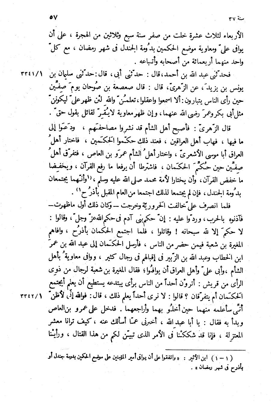 الأربعاء لثلاث عشرة خلت من صفر سنة سبع وثلاثين من الهجرة، عَلَى أن يوافي علي ومعاوية موضع الحكمين بدومة الجندل فِي شهر رمضان، مع كل واحد منهما أربعمائة من أَصْحَابه وأتباعه فَحدثني عَبْدُ اللَّهِ بْنُ أحمد، قال: حدثني أبي، قال: حدثني سليمان بْنُ يُونُسَ بْنِ يَزِيدَ، عَنِ الزُّهْرِيِّ، قَالَ: قَالَ صَعْصَعَةُ بْنُ صَوْحَانَ يَوْمَ صِفِّينَ حِينَ رَأَى النَّاسَ يَتَبَارَوْنَ: أَلا اسْمَعُوا وَاعْقِلُوا، تَعْلَمُنَّ وَاللَّهِ لَئِنْ ظَهَرَ عَلِيٌّ لَيَكُونَنَّ مِثْلَ أَبِي بَكْرٍ وَعُمَرَ رَضِيَ اللَّهُ عَنْهُمَا، وَإِنْ ظَهَرَ مُعَاوِيَةُ لا يَقِرُّ لِقَائِلٍ بِقَوْلِ حَقٍّ.