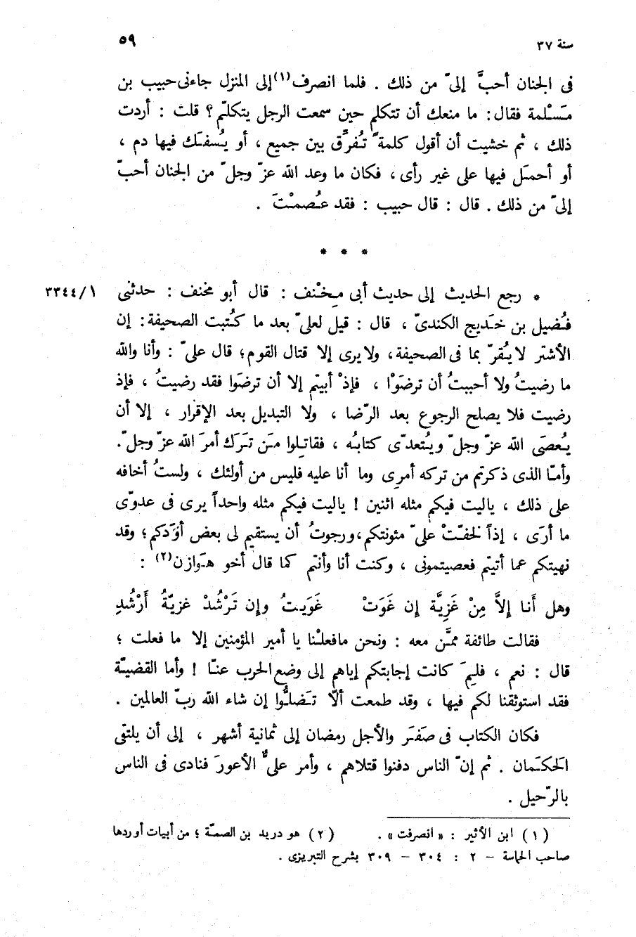 رجع الحديث إِلَى حديث أبي مخنف: قَالَ أَبُو مخنف: حَدَّثَنِي فضيل بن خديج الكندي، [قَالَ: قيل لعلي بعد مَا كتبت الصحيفة: إن الأَشْتَر لا يقر بِمَا فِي الصحيفة، وَلا يرى إلا قتال القوم، قَالَ علي: وأنا وَاللَّهِ مَا رضيت وَلا أحببت أن ترضوا، فإذ أبيتم إلا أن ترضوا فقد رضيت، فإذ رضيت فلا يصلح الرجوع بعد الرضا، وَلا التبديل بعد الإقرار، إلا أن يعصى اللَّه عَزَّ وَجَلَّ ويتعدى كتابه، فقاتلوا من ترك أمر اللَّه عَزَّ وَجَلَّ.