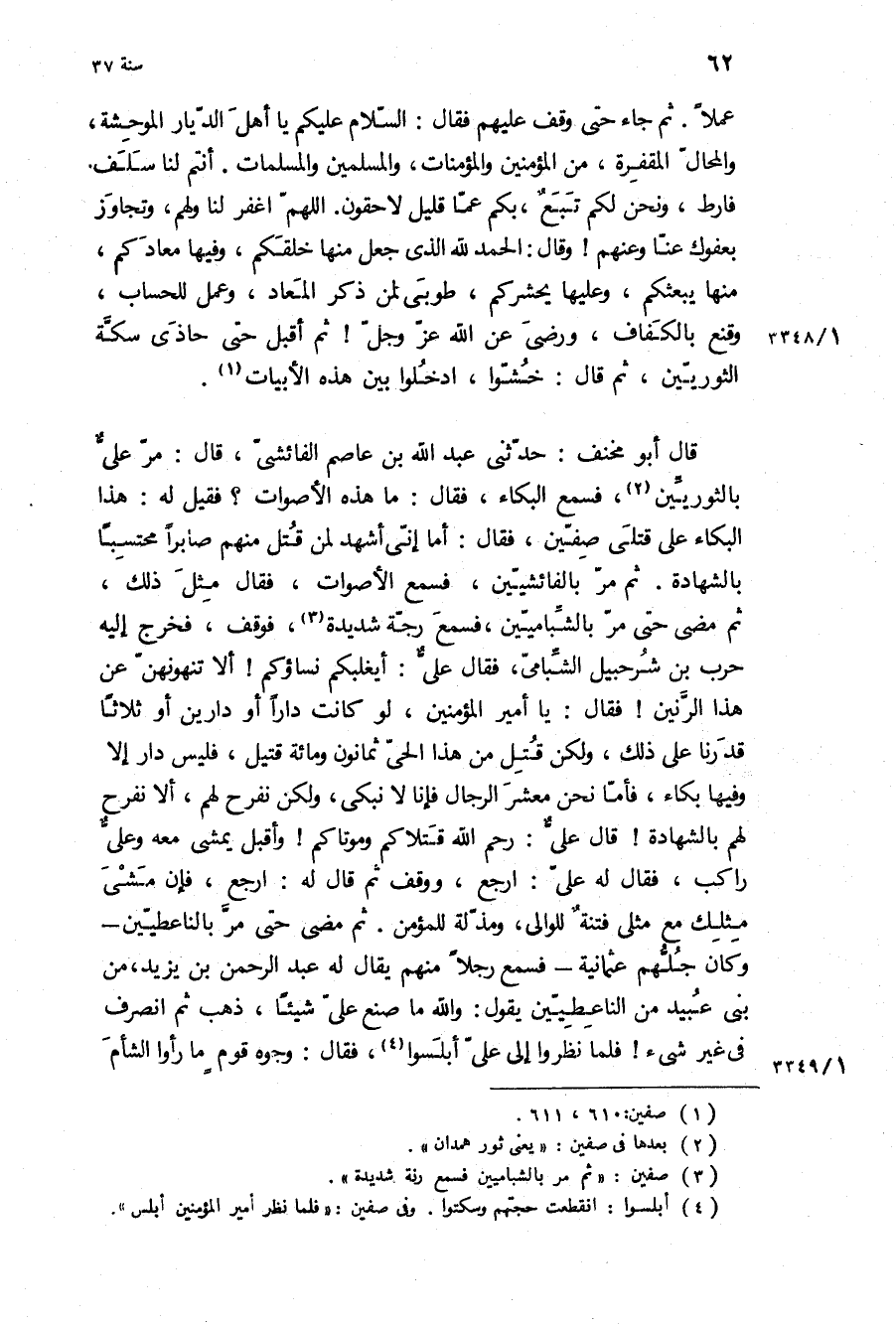 قَالَ أَبُو مخنف: حَدَّثَنِي عَبْدُ اللَّهِ بْنُ عاصم الفائشي، قَالَ: [مر علي بالثوريين، فسمع البكاء، فَقَالَ: مَا هَذِهِ الأصوات؟ فقيل لَهُ: هَذَا البكاء عَلَى قتلى صفين، فَقَالَ: أما إني أشهد لمن قتل مِنْهُمْ صابرا محتسبا بالشهادة] ثُمَّ مر بالفائشيين، فسمع الأصوات، فَقَالَ مثل ذَلِكَ، ثُمَّ مضى حَتَّى مر بالشباميين، فسمع رجة شديدة، فوقف، فخرج إِلَيْهِ حرب بن شُرَحْبِيل الشبامي، [فَقَالَ علي: أيغلبكم نساؤكم! أَلا تنهونهن عن هَذَا الرنين! فَقَالَ: يَا أَمِيرَ الْمُؤْمِنِينَ، لو كَانَتْ دارا أو دارين أو ثلاثا قدرنا عَلَى ذَلِكَ، ولكن قتل من هَذَا الحي ثمانون ومائة قتيل، فليس دار إلا وفيها بكاء، فأما نحن معشر الرجال فإنا لا نبكي، ولكن نفرح لَهُمْ، أَلا نفرح لَهُمْ بالشهادة! قَالَ علي: رحم اللَّه قتلاكم وموتاكم! وأقبل يمشي مَعَهُ وعلي راكب، فَقَالَ لَهُ علي: ارجع، ووقف ثُمَّ قَالَ لَهُ: ارجع، فإن مشي مثلك مع مثلي فتنة للوالي، ومذلة للمؤمن] ثُمَّ مضى حَتَّى مر بالناعطيين- وَكَانَ جلهم عثمانية- فسمع رجلا مِنْهُمْ يقال لَهُ عبد الرَّحْمَن بن يزيد، من بنى عبيد من الناعطيين يقول: وَاللَّهِ مَا صنع علي شَيْئًا، ذهب ثُمَّ انصرف فِي غير شَيْء! فلما نظروا إِلَى علي أبلسوا، فَقَالَ: وجوه قوم ما رأوا الشام