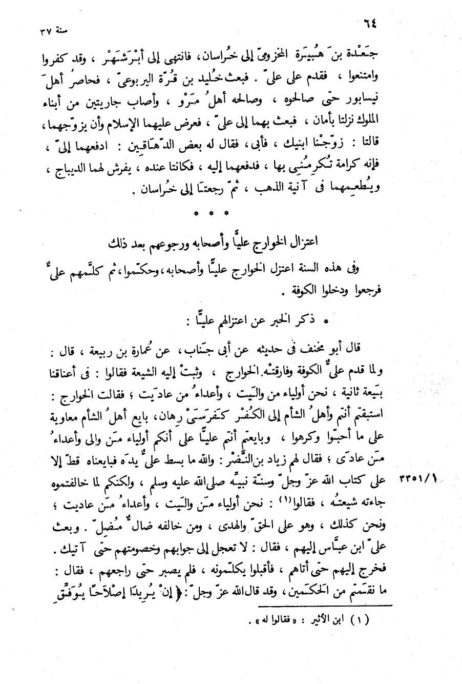 وفي هَذِهِ السنة اعتزل الخوارج عَلِيًّا وأَصْحَابه، وحكموا، ثُمَّ كلمهم علي فرجعوا ودخلوا الْكُوفَة.