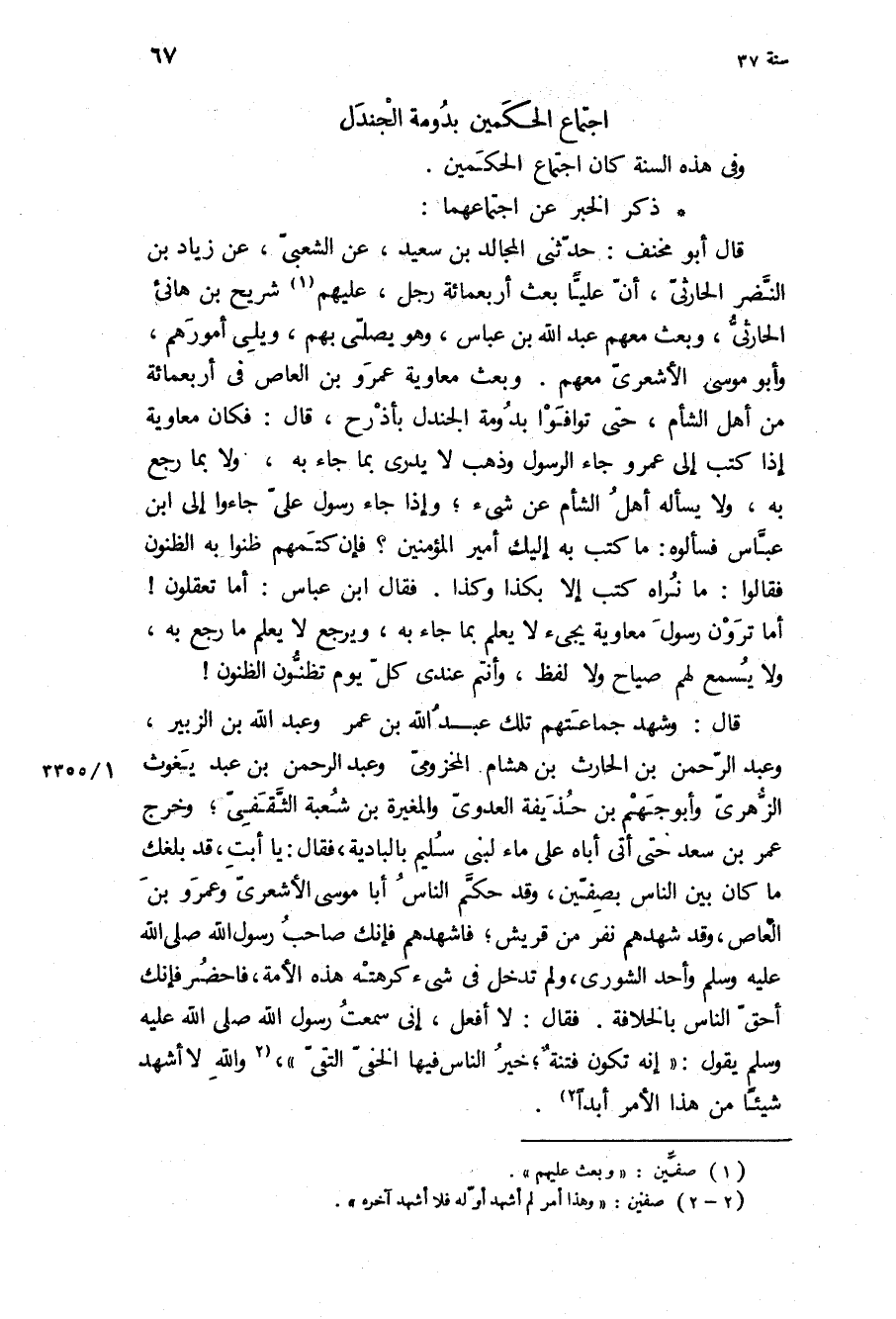 قال أبو مخنف: حدثني المجالد بن سعيد، عَنِ الشَّعْبِيِّ، عن زياد بن النضر الحارثي، ان عليا بعث أربعمائة رجل، عَلَيْهِم شريح بن هانئ الحارثي، وبعث معهم عَبْد اللَّهِ بن عباس، وَهُوَ يصلي بهم، ويلي أمورهم، وأبو مُوسَى الأَشْعَرِيّ معهم وبعث معاويه عمرو بن العاص في أربعمائة من أهل الشام، حَتَّى توافوا بدومة الجندل بأذرح، قَالَ: فكان مُعَاوِيَة إذا كتب إِلَى عَمْرو جَاءَ الرسول وذهب لا يدري بِمَا جَاءَ بِهِ، وَلا بِمَا رجع بِهِ، وَلا يسأله أهل الشام عن شَيْء، وإذا جَاءَ رسول علي جاءوا إِلَى ابن عَبَّاس فسألوه: مَا كتب بِهِ إليك أَمِير الْمُؤْمِنِينَ؟ فإن كتمهم ظنوا بِهِ الظنون فَقَالُوا: مَا نراه كتب إلا بكذا وكذا فَقَالَ ابن عَبَّاس: أما تعقلون! أما ترون رسول مُعَاوِيَة يجيء لا يعلم بِمَا جَاءَ بِهِ، ويرجع لا يعلم مَا رجع بِهِ، وَلا يسمع لَهُمْ صياح وَلا لفظ، وَأَنْتُمْ عندي كل يوم تظنون الظنون! قَالَ: وشهد جماعتهم تِلَكَ عَبْد الله بن عمر وعبد الله بن الزبير، وعبد الرَّحْمَن بن الْحَارِث بن هِشَام المخزومي وعبد الرَّحْمَن بن عَبْدِ يَغُوثَ الزُّهْرِيّ وأبو جهم بن حُذَيْفَة العدوي والْمُغِيرَة بن شُعْبَةَ الثقفي، [وخرج عُمَر بن سَعْد حَتَّى أتى أباه عَلَى ماء لبني سليم بالبادية، فَقَالَ: يَا أبت، قَدْ بلغك مَا كَانَ بين الناس بصفين، وَقَدْ حكم الناس أبا مُوسَى الأَشْعَرِيّ وعمرو بن الْعَاصِ، وَقَدْ شهدهم نفر من قريش، فاشهدهم فإنك صاحب رَسُول اللَّهِ ص وأحد الشورى، ولم تدخل فِي شَيْءٍ كرهته هَذِهِ الأمة، فاحضر فإنك أحق الناس بالخلافة فَقَالَ: لا أفعل، إني سمعت رَسُول اللَّهِ ص يقول: انه تكون فتنة، خير الناس فِيهَا الخفي التقي، وَاللَّهِ لا أشهد شَيْئًا من هَذَا الأمر أبدا]