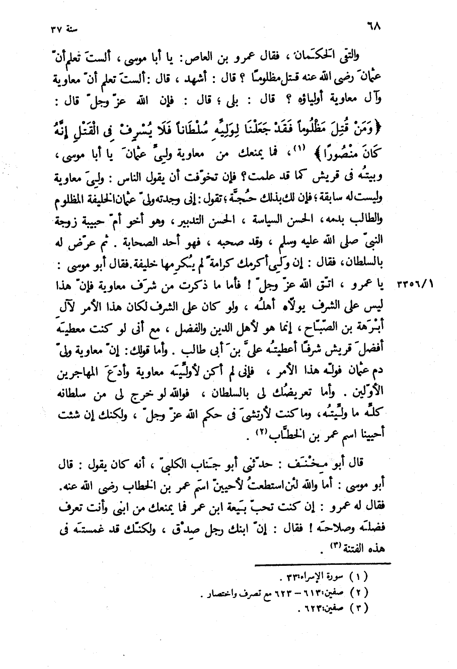 «وَمَنْ قُتِلَ مَظْلُوماً فَقَدْ جَعَلْنا لِوَلِيِّهِ سُلْطاناً فَلا يُسْرِفْ فِي الْقَتْلِ إِنَّهُ كانَ مَنْصُوراً» ، فما يمنعك من مُعَاوِيَة ولي عُثْمَان يَا أَبَا مُوسَى، وبيته فِي قريش كما قَدْ علمت؟ فإن تخوفت أن يقول الناس: ولي مُعَاوِيَة وليست لَهُ سابقة، فإن لك بِذَلِكَ حجة، تقول: إني وجدته ولي عُثْمَان الخليفة المظلوم والطالب بدمه، الْحَسَن السياسة، الْحَسَن التدبير، وهو أخو أم حبيبه زوجه النبي ص، وَقَدْ صحبه، فهو أحد الصحابة ثُمَّ عرض لَهُ بالسلطان، فَقَالَ: إن ولي أكرمك كرامة لم يكرمها خليفة فَقَالَ أَبُو مُوسَى: