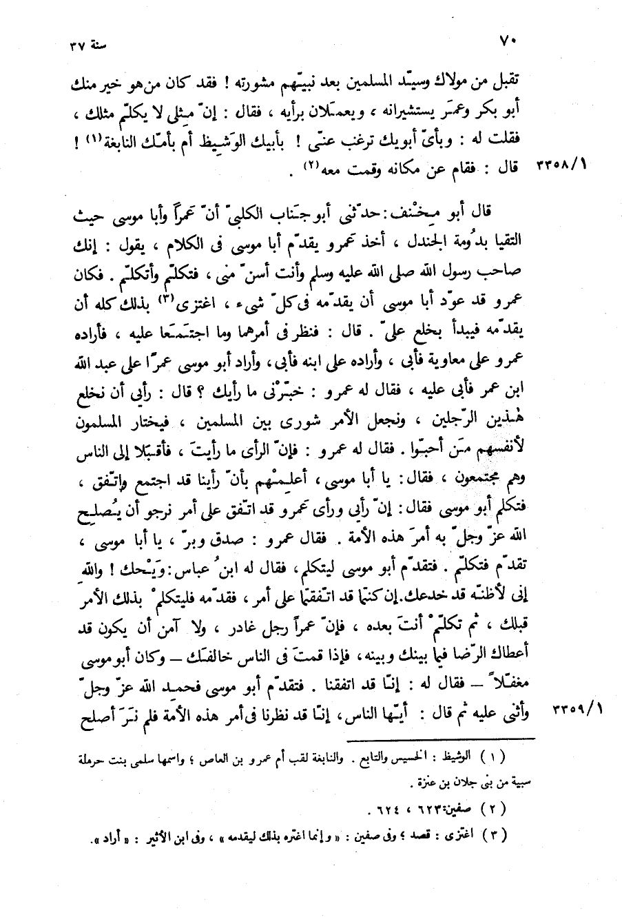 تقبل من مولاك وسيد الْمُسْلِمِينَ بعد نبيهم مشورته! فقد كَانَ من هُوَ خير مِنْكَ ابو بكر وعمر يستشيرانه، ويعملان برأيه، فَقَالَ: إن مثلي لا يكلم مثلك، فقلت لَهُ: وبأي أبويك ترغب عني! بأبيك الوشيظ أم بأمك النابغة! قَالَ: فقام عن مكانه وقمت مَعَهُ قَالَ أَبُو مخنف: حَدَّثَنِي أَبُو جناب الكلبي أن عمرا وأبا مُوسَى حَيْثُ التقيا بدومة الجندل، أخذ عَمْرو يقدم أبا مُوسَى فِي الكلام، يقول: انك صاحب رسول الله ص وأنت أسن مني، فتكلم وأتكلم فكان عَمْرو قَدْ عود أبا مُوسَى أن يقدمه فِي كل شَيْء، اغتزى بِذَلِكَ كله أن يقدمه فيبدأ بخلع علي قَالَ: فنظر فِي أمرهما وما اجتمعا عَلَيْهِ، فأراده عَمْرو عَلَى مُعَاوِيَة فأبى، وأراده عَلَى ابنه فأبى، وأراد أَبُو موسى عمرا على عبد الله ابن عمر فأبى عليه، فقال له عمرو: خبرني مَا رأيك؟ قَالَ: رأيي أن نخلع هَذَيْنِ الرجلين، ونجعل الأمر شورى بين الْمُسْلِمِينَ، فيختار الْمُسْلِمُونَ لأنفسهم من أحبوا فَقَالَ لَهُ عَمْرو: فإن الرأي مَا رأيت، فأقبلا إِلَى النَّاسِ وهم مجتمعون، فَقَالَ: يَا أَبَا مُوسَى، أعلمهم بأن رأينا قَدِ اجتمع واتفق، فتكلم أَبُو مُوسَى فَقَالَ: إن رأيي ورأي عَمْرو: قَدِ اتفق عَلَى أمر نرجو أن يصلح اللَّه عَزَّ وَجَلَّ بِهِ أمر هَذِهِ الأمة فَقَالَ عَمْرو: صدق وبر، يَا أَبَا مُوسَى، تقدم فتكلم فتقدم أَبُو مُوسَى ليتكلم، فَقَالَ لَهُ ابن عَبَّاس: ويحك! وَاللَّهِ إني لأظنه قَدْ خدعك إن كنتما قَدِ اتفقتما عَلَى أمر، فقدمه فليتكلم بِذَلِكَ الأمر قبلك، ثُمَّ تكلم أنت بعده، فإن عمرا رجل غادر، وَلا آمن أن يكون قَدْ أعطاك الرضا فِيمَا بينك وبينه، فإذا قمت فِي الناس خالفك- وكان ابو موسى مغفلا- فقال له: إنا قَدِ اتفقنا فتقدم أَبُو مُوسَى فَحَمِدَ اللَّهَ عَزَّ وَجَلَّ وأثنى عَلَيْهِ ثُمَّ قَالَ: أَيُّهَا النَّاسُ، إنا قَدْ نظرنا فِي أمر هَذِهِ الأمة فلم نر أصلح