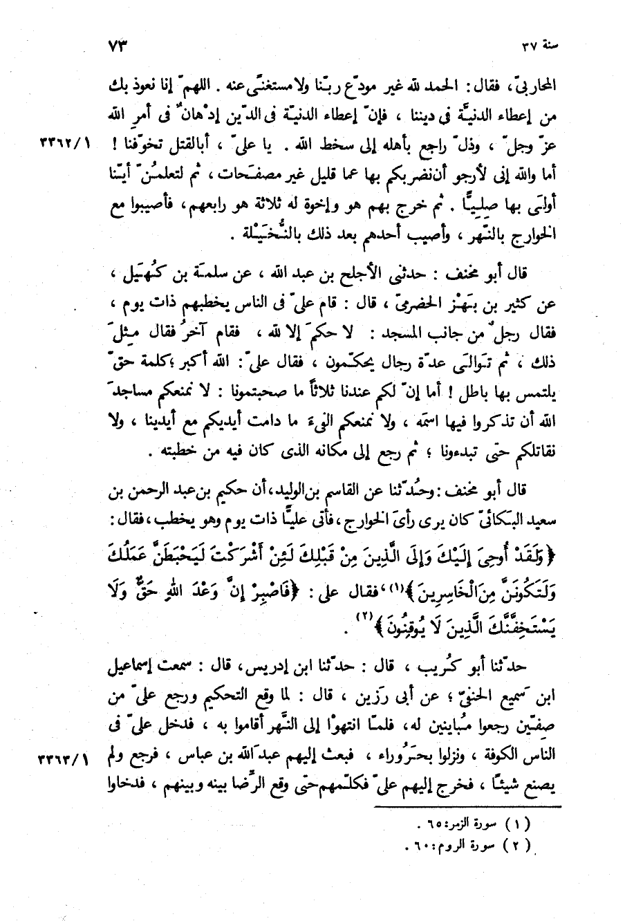 قَالَ أَبُو مخنف: حَدَّثَنِي الأجلح بن عَبْدِ اللَّهِ، عن سلمة بن كهيل، عن كثير بن بهز الحضرمي، قَالَ: قام علي فِي الناس يخطبهم ذات يوم، فَقَالَ رجل من جانب المسجد: لا حكم إلا لِلَّهِ، فقام آخر فَقَالَ مثل ذَلِكَ، ثُمَّ توالى عدة رجال يحكمون، فَقَالَ علي: اللَّه أكبر، كلمة حق يلتمس بِهَا باطل! أما إن لكم عندنا ثلاثا مَا صحبتمونا: لا نمنعكم مساجد اللَّه أن تذكروا فِيهَا اسمه، وَلا نمنعكم الفيء مَا دامت أيديكم مع أيدينا، وَلا نقاتلكم حَتَّى تبدءونا، ثُمَّ رجع إِلَى مكانه الَّذِي كَانَ فِيهِ من خطبته.