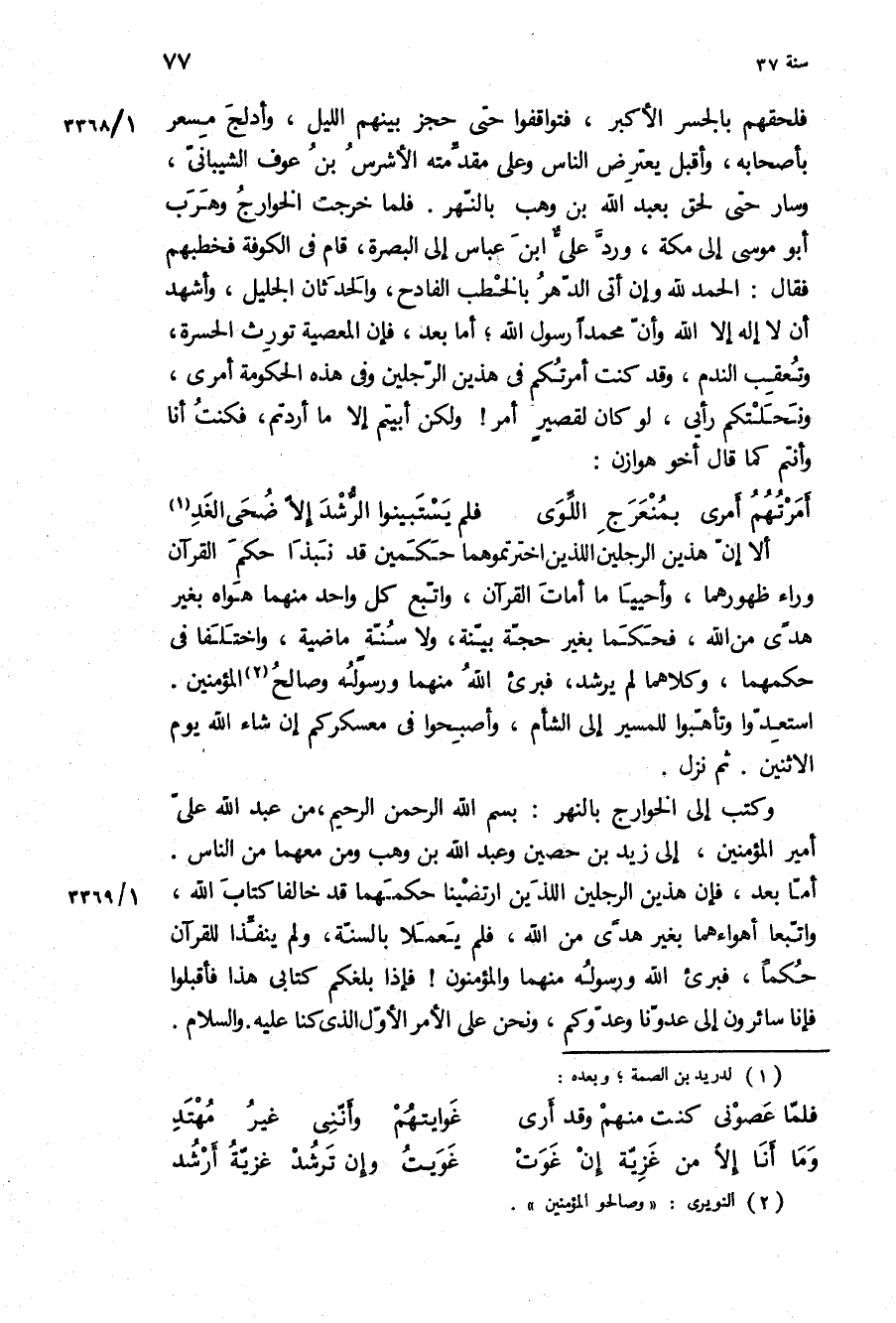 فلحقهم بالجسر الاكبر، فتوافقوا حَتَّى حجز بينهم الليل، وأدلج مسعر بأَصْحَابه، وأقبل يعترض الناس وعلى مقدمته الأشرس بن عوف الشيباني، وسار حَتَّى لحق بعبد اللَّه بن وهب بالنهر فلما خرجت الخوارج وهرب أَبُو مُوسَى إِلَى مكة، ورد علي ابن عَبَّاس إِلَى الْبَصْرَة، قام فِي الْكُوفَة فخطبهم فَقَالَ: الحمد لِلَّهِ وإن أتى الدهر بالخطب الفادح، والحدثان الجليل، وأشهد أَنْ لَا إِلَهَ إِلَّا اللَّهُ وَأَنَّ مُحَمَّدًا رَسُول اللَّهِ، أَمَّا بَعْدُ، فإن المعصية تورث الحسرة، وتعقب الندم، وَقَدْ كنت أمرتكم فِي هَذَيْنِ الرجلين وفي هَذِهِ الحكومة أمري، ونحلتكم رأيي، لو كَانَ لقصير أمر! ولكن أبيتم إلا مَا أردتم، فكنت أنا وَأَنْتُمْ كما قَالَ أخو هوازن: