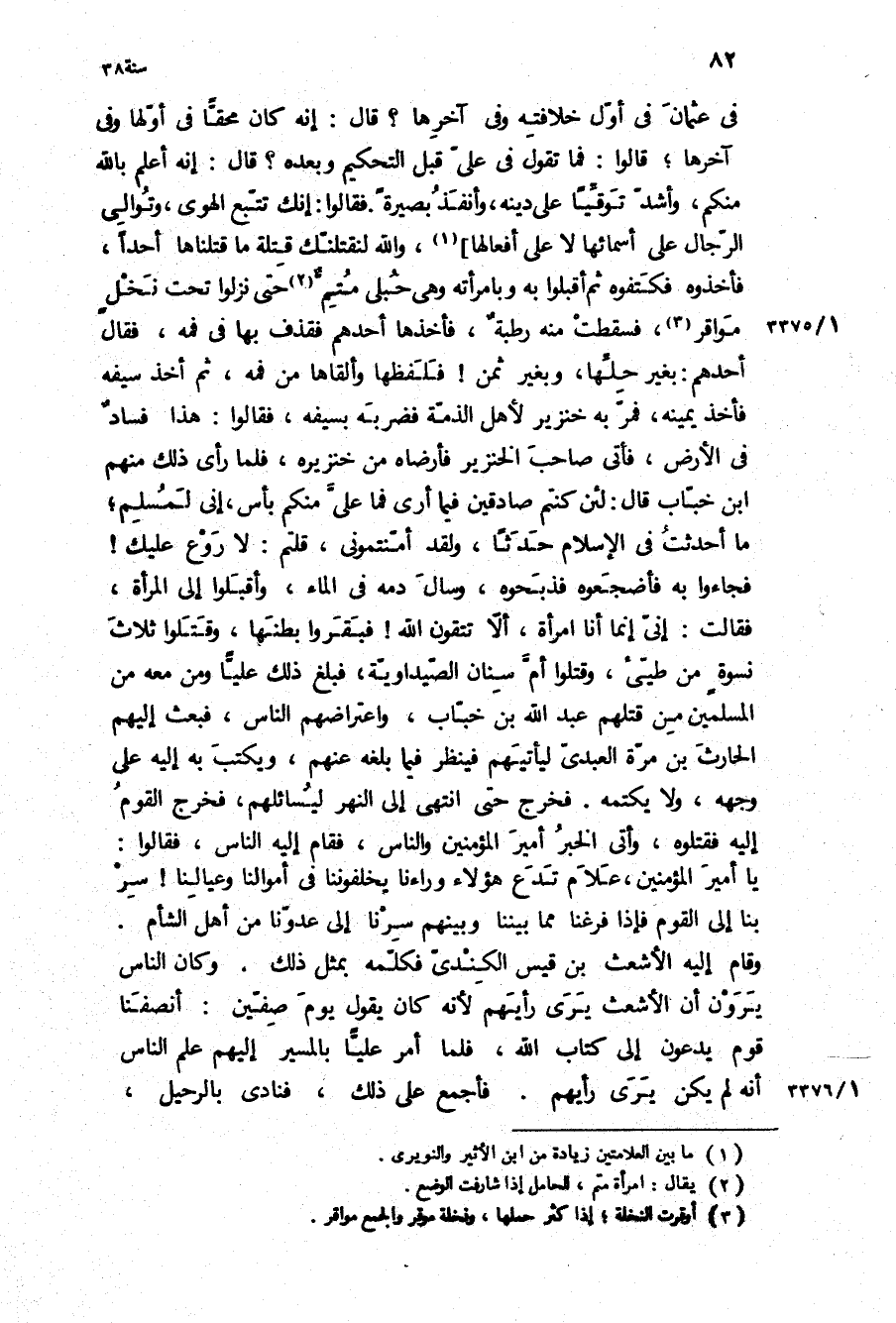 فِي عُثْمَان فِي أول خلافته وفي آخرها؟ قَالَ: إنه كَانَ محقا فِي أولها وفي آخرها، قَالُوا: فما تقول فِي علي قبل التحكيم وبعده؟ قَالَ: إنه أعلم بِاللَّهِ مِنْكُمْ، وأشد توقيا عَلَى دينه، وأنفذ بصيرة فَقَالُوا: إنك تتبع الهوى، وتوالي الرجال عَلَى أسمائها لا عَلَى أفعالها، وَاللَّهِ لنقتلنك قتلة مَا قتلناها أحدا، فأخذوه فكتفوه ثُمَّ أقبلوا بِهِ وبامرأته وَهِيَ حبلى متم حَتَّى نزلوا تحت نخل مواقر، فسقطت مِنْهُ رطبة، فأخذها أحدهم فقذف بِهَا فِي فمه، فَقَالَ أحدهم: بغير حلها، وبغير ثمن! فلفظها وألقاها من فمه، ثم أخذ سيفه فاخذ يمينه، فمر بِهِ خنزير لأهل الذمة فضربه بسيفه، فَقَالُوا: هَذَا فساد فِي الأرض، فأتى صاحب الخنزير فأرضاه من خنزيره، فلما رَأَى ذَلِكَ مِنْهُمُ ابن خباب قَالَ: لَئِنْ كنتم صادقين فِيمَا أَرَى فما علي مِنْكُمْ بأس، إني لمسلم، مَا أحدثت فِي الإِسْلام حدثا، وَلَقَدْ أمنتموني، قلتم: لا روع عَلَيْك! فجاءوا بِهِ فأضجعوه فذبحوه، وسال دمه فِي الماء، وأقبلوا إِلَى المرأة، فَقَالَتْ: إني إنما أنا امرأة، أَلا تتقون اللَّه! فبقروا بطنها، وقتلوا ثلاث نسوة من طيئ، وقتلوا أم سنان الصيداوية، فبلغ ذَلِكَ عَلِيًّا ومن مَعَهُ مِنَ الْمُسْلِمِينَ من قتلهم عَبْد اللَّهِ بن خباب، واعتراضهم الناس، فبعث إِلَيْهِم الْحَارِث بن مُرَّةَ العبدي ليأتيهم فينظر فِيمَا بلغه عَنْهُمْ، ويكتب بِهِ إِلَيْهِ عَلَى وجهه، وَلا يكتمه فخرج حَتَّى انتهى إِلَى النهر ليسائلهم، فخرج القوم إِلَيْهِ فقتلوه، وأتى الخبر أَمِير الْمُؤْمِنِينَ والناس، فقام إِلَيْهِ الناس، فَقَالُوا: