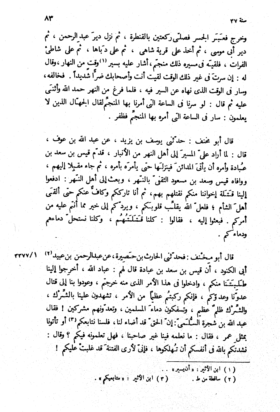 قَالَ أَبُو مخنف: فَحَدَّثَنِي الْحَارِث بن حصيرة، عن عبد الرَّحْمَن بن عبيد أبي الكنود، أن قيس بن سَعْدِ بْنِ عبادة قَالَ لَهُمْ: عباد اللَّه، أخرجوا إلينا طلبتنا مِنْكُمْ، وادخلوا فِي هَذَا الأمر الَّذِي مِنْهُ خرجتم، وعودوا بنا إِلَى قتال عدونا وعدوكم، فإنكم ركبتم عظيما من الأمر، تشهدون علينا بالشرك، والشرك ظلم عظيم، وتسفكون دماء الْمُسْلِمِينَ، وتعدونهم مشركين! فَقَالَ عَبْد اللَّهِ بن شجرة السلمي: إن الحق قَدْ أضاء لنا، فلسنا نتابعكم أو تأتونا بمثل عمر، فَقَالَ: مَا نعلمه فينا غير صاحبنا، فهل تعلمونه فيكم؟ وَقَالَ: