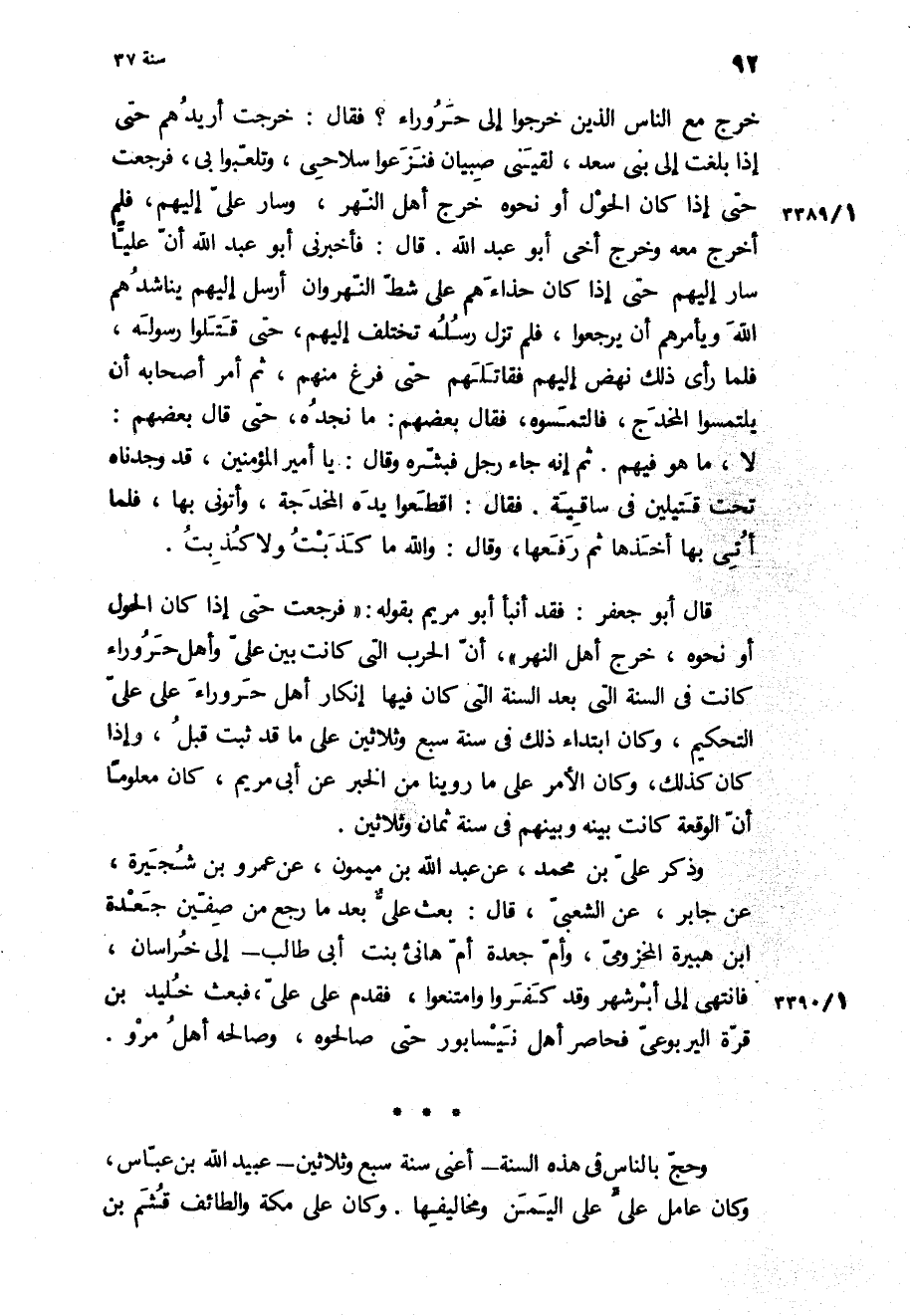 قَالَ أَبُو جَعْفَر: فقد أنبأ أَبُو مريم بقوله: فرجعت حَتَّى إذا كَانَ الحول أو نحوه، خرج أهل النهر، أن الحرب الَّتِي كَانَتْ بين علي وأهل حروراء كَانَتْ فِي السنة الَّتِي بعد السنة الَّتِي كَانَ فِيهَا إنكار أهل حروراء عَلَى علي التحكيم، وَكَانَ ابتداء ذَلِكَ فِي سنة سبع وثلاثين عَلَى مَا قَدْ ثبت قبل، وإذا كَانَ كذلك، وَكَانَ الأمر عَلَى مَا روينا من الخبر عن أبي مريم، كَانَ معلوما أن الوقعة كَانَتْ بينه وبينهم فِي سنة ثمان وثلاثين.