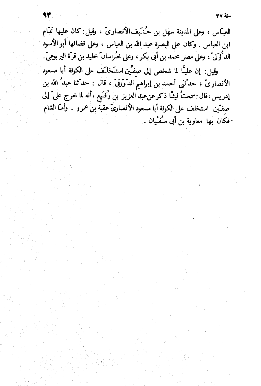 العباس، وعلى الْمَدِينَة سَهْل بن حنيف الأَنْصَارِيّ، وقيل: كان عليها تمام ابن العباس وَكَانَ عَلَى الْبَصْرَة عَبْد اللَّهِ بن العباس، وعلى قضائها أَبُو الأسود الدؤلي، وعلى مصر مُحَمَّد بن أبي بكر، وعلى خُرَاسَان خليد بن قرة اليربوعي.