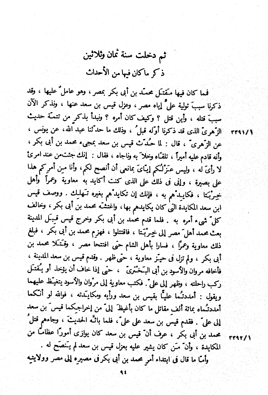 فمما كَانَ فِيهَا مقتل مُحَمَّد بن أبي بكر بمصر، وَهُوَ عامل عَلَيْهَا، وَقَدْ ذكرنا سبب تولية علي إِيَّاهُ مصر، وعزل قيس بن سَعْد عنها، ونذكر الآن سبب قتله، وأين قتل؟ وكيف كَانَ أمره؟ ونبدأ بذكر من تتمة حديث الزُّهْرِيّ الَّذِي قَدْ ذكرنا أوله قبل، وَذَلِكَ مَا حَدَّثَنَا عَبْد اللَّهِ، عن يونس، عَنِ الزُّهْرِيِّ، قَالَ: لما حدث قيس بن سَعْد بمجيء مُحَمَّد بن أبي بكر، وأنه قادم عَلَيْهِ أميرا، تلقاه وخلا بِهِ وناجاه، فَقَالَ: إنك جئت من عِنْدَ امرئ لا رأي لَهُ، وليس عزلكم إياي بمانعي أن أنصح لكم، وأنا من أمركم هَذَا عَلَى بصيرة، وإني فِي ذَلِكَ عَلَى الَّذِي كنت أكايد بِهِ مُعَاوِيَة وعمرا وأهل خربتا، فكايدهم بِهِ، فإنك إن تكايدهم بغيره تهلك ووصف قيس ابن سَعْد المكايدة الَّتِي كَانَ يكايدهم بِهَا، واغتشه مُحَمَّد بن أبي بكر، وخالف كل شَيْء أمره بِهِ فلما قدم مُحَمَّد بن أبي بكر وخرج قيس قبل الْمَدِينَة بعث مُحَمَّد أهل مصر إِلَى خربتا، فاقتتلوا، فهزم مُحَمَّد بن أبي بكر، فبلغ ذَلِكَ مُعَاوِيَة وعمرا، فسارا بأهل الشام حَتَّى افتتحا مصر، وقتلا مُحَمَّد بن أبي بكر، ولم تزل فِي حيز مُعَاوِيَة، حَتَّى ظهر وقدم قيس بن سَعْد الْمَدِينَة، فأخافه مَرْوَان والأسود بن أَبِي الْبَخْتَرِيِّ، حَتَّى إذا خاف أن يؤخذ أو يقتل ركب راحلته، وظهر إِلَى علي فكتب مُعَاوِيَة إِلَى مَرْوَان والأسود يتغيظ عليهما ويقول: أمددتما عَلِيًّا بقيس بن سَعْدٍ ورأيه ومكايدته، فو الله لو أنكما أمددتماه بمائة ألف مقاتل مَا كَانَ بأغيظ إلي من إخراجكما قيس بن سَعْد إِلَى علي فقدم قيس بن سَعْد عَلَى علي، فلما باثه الحديث، وجاءهم قتل مُحَمَّد بن أبي بكر، عرف أن قيس بن سَعْد كَانَ يوازي أمورا عظاما من المكايدة، وأن من كَانَ يشير عَلَيْهِ بعزل قيس بن سَعْد لم ينصح لَهُ.