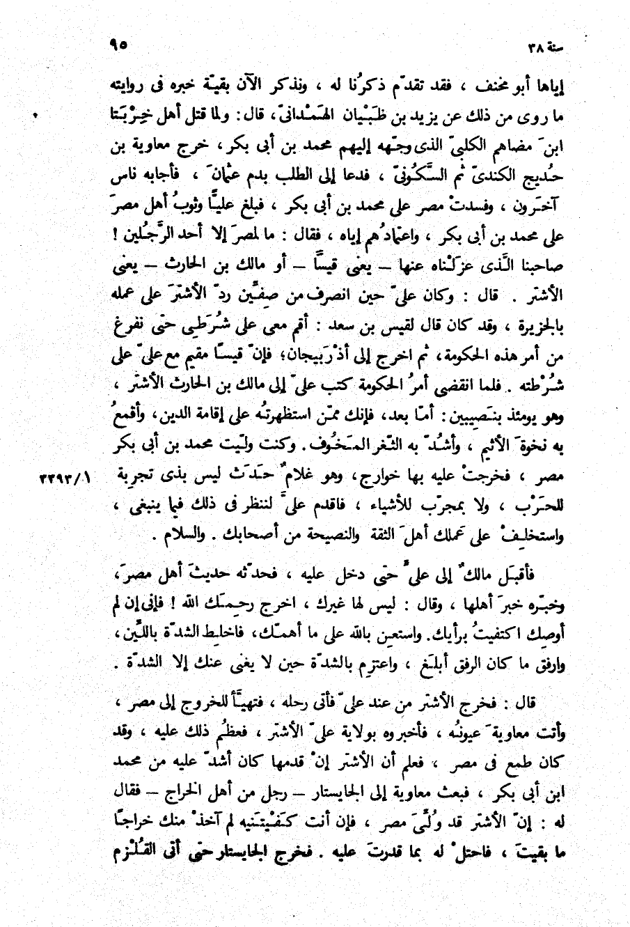 إياها أَبُو مخنف، فقد تقدم ذكرنا لَهُ، ونذكر الآن بقية خبره فِي روايته مَا روي من ذَلِكَ عن يَزِيد بن ظبيان الهمداني، قَالَ: ولما قتل أهل خربتا ابن مضاهم الكلبي الَّذِي وجهه إِلَيْهِم مُحَمَّد بن أبي بكر، خرج مُعَاوِيَة بن حديج الكندي ثُمَّ السكوني، فدعا إِلَى الطلب بدم عُثْمَان، فأجابه ناس آخرون، وفسدت مصر عَلَى مُحَمَّد بن أبي بكر، فبلغ عَلِيًّا وثوب أهل مصر عَلَى مُحَمَّد بن أبي بكر، واعتمادهم إِيَّاهُ، فَقَالَ: مَا لمصر إلا أحد الرجلين! صاحبنا الَّذِي عزلناه عنها- يعني قيسا- أو مالك بن الْحَارِث- يعني الأَشْتَر قَالَ: وَكَانَ علي حين انصرف من صفين رد الأَشْتَر عَلَى عمله بالجزيرة، وَقَدْ كَانَ قَالَ لقيس بن سعد: أقم معى على شرطى حَتَّى نفرغ من أمر هَذِهِ الحكومة، ثُمَّ أخرج إِلَى أذربيجان، فإن قيسا مقيم مع علي عَلَى شرطته فلما انقضى أمر الحكومة كتب علي إِلَى مالك بن الْحَارِث الأَشْتَر، وَهُوَ يَوْمَئِذٍ بنصيبين: أَمَّا بَعْدُ، فإنك ممن استظهرته عَلَى إقامة الدين، وأقمع بِهِ نخوة الأثيم، وأشد بِهِ الثغر المخوف وكنت وليت مُحَمَّد بن أبي بكر مصر، فخرجت عَلَيْهِ بِهَا خوارج، وَهُوَ غلام حدث ليس بذي تجربة للحرب، وَلا بمجرب للأشياء، فاقدم علي لننظر فِي ذَلِكَ فِيمَا ينبغي، واستخلف عَلَى عملك أهل الثقة والنصيحة من أَصْحَابك والسلام.