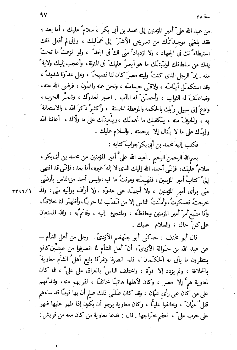 بسم الله الرحمن الرحيم لعبد الله علي أَمِير الْمُؤْمِنِينَ من مُحَمَّد بن أبي بكر، سَلامٌ عَلَيْكَ، فَإِنِّي أَحْمَدُ اللَّهَ إِلَيْكَ الَّذِي لا إله غيره، أَمَّا بَعْدُ، فإني قَدِ انتهى إلي كتاب أَمِير الْمُؤْمِنِينَ، ففهمته وعرفت مَا فِيهِ، وليس أحد مِنَ النَّاسِ بأرضى مني برأي أَمِير الْمُؤْمِنِينَ، وَلا أجهد عَلَى عدوه، وَلا أرأف بوليه مني، وَقَدْ خرجت فعسكرت، وآمنت الناس إلا من نصب لنا حربا، وأظهر لنا خلافا، وأنا متبع أمر أَمِير الْمُؤْمِنِينَ وحافظه، وملتجئ إِلَيْهِ، وقائم بِهِ، وَاللَّهِ المستعان عَلَى كل حال، والسلام عَلَيْك.