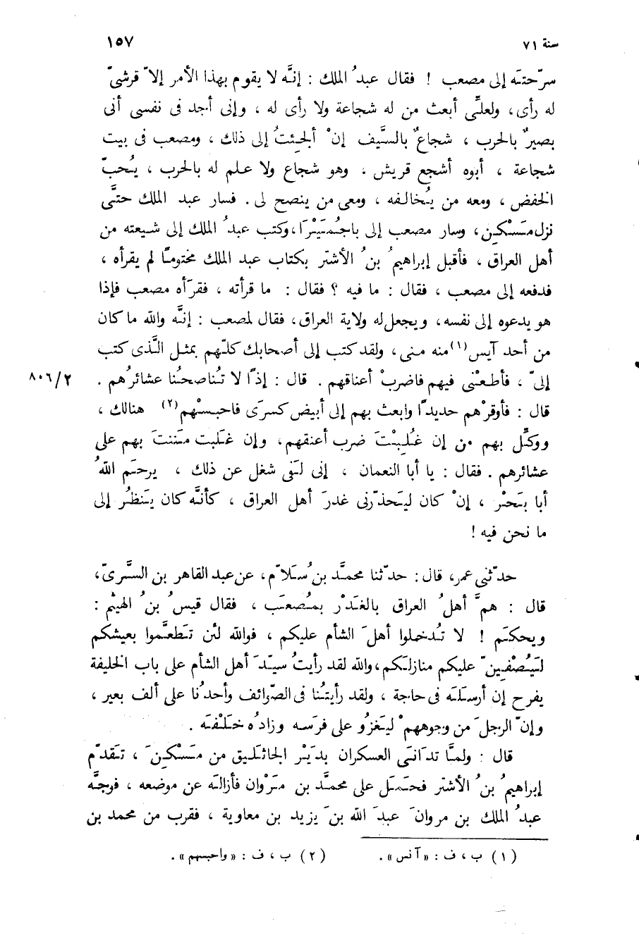 سرحته إلى مصعب! فقال عبد الملك: إنه لا يقوم بهذا الأمر إلا قرشي له رأي، ولعلي أبعث من له شجاعة ولا رأي له، وإني أجد في نفسي أني بصير بالحرب، شجاع بالسيف إن ألجئت إلى ذلك ومصعب في بيت شجاعة، أبوه أشجع قريش، وهو شجاع ولا علم له بالحرب يحب الخفض، ومعه من يخالفه ومعي من ينصح لي فسار عبد الملك حتى نزل مسكن، وسار مصعب إلى باجميرا، وكتب عبد الملك إلى شيعته من أهل العراق، فأقبل إبراهيم بن الأشتر بكتاب عبد الملك مختوما لم يقرأه، فدفعه إلى مصعب، فقال: ما فيه؟ فقال: ما قرأته، فقرأه مصعب فإذا هو يدعوه إلى نفسه، ويجعل له ولاية العراق، فقال لمصعب: إنه والله ما كان من أحد آيس منه مني، ولقد كتب إلى أصحابك كلهم بمثل الذي كتب إلي، فأطعني فيهم فاضرب أعناقهم قال: إذا لا تناصحنا عشائرهم قال: فأوقرهم حديدا وابعث بهم إلى أبيض كسرى فاحبسهم هنالك، ووكل بهم من إن غلبت ضرب أعنقهم، وإن غلبت مننت بهم على عشائرهم فقال: يا أبا النعمان، إني لفي شغل عن ذلك، يرحم الله أبا بحر، إن كان ليحذرني غدر أهل العراق، كأنه كان ينظر إلى ما نحن فيه! حدثني عمر، قال: حدثنا مُحَمَّد بن سلام، عن عبد القاهر بن السري، قال: هم أهل العراق بالغدر بمصعب، فقال قيس بن الهيثم: