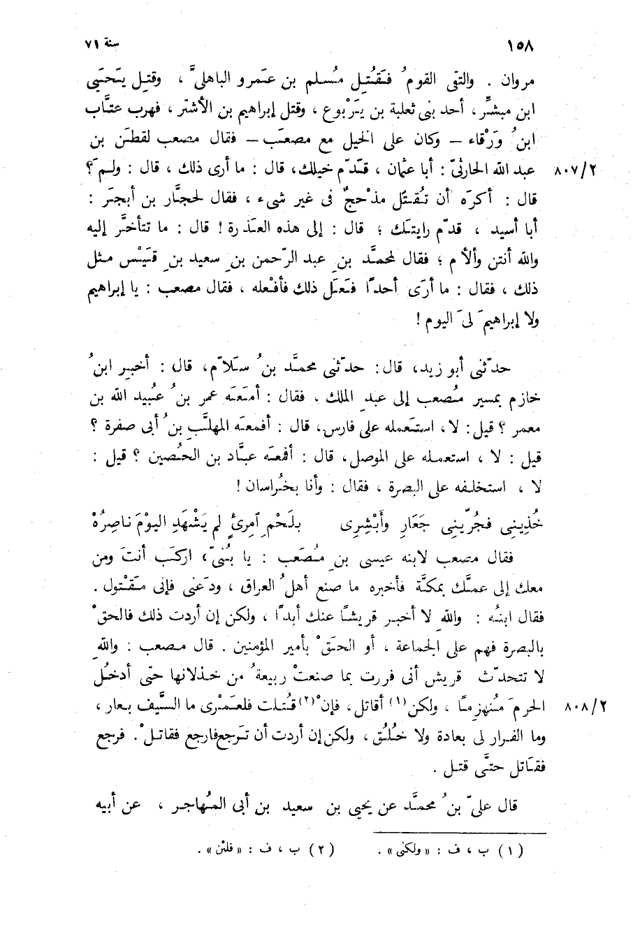 أبا أسيد، قدم رايتك، قال: إلى هذه العذرة! قال: ما تتأخر إليه والله أنتن وألأم، فقال لمُحَمَّد بن عبد الرحمن بن سعيد بن قيس مثل ذلك، فقال: ما أرى أحدا فعل ذلك فأفعله، فقال مصعب: يا إبراهيم ولا إبراهيم لي اليوم! حدثني أبو زيد، قال: حدثني مُحَمَّد بن سلام، قال: أخبر ابن خازم بمسير مصعب إلى عبد الملك، فقال: أمعه عمر بن عبيد الله بن معمر؟ قيل: لا، استعمله على فارس، قال: افمعه المهلب بن ابى صفره؟