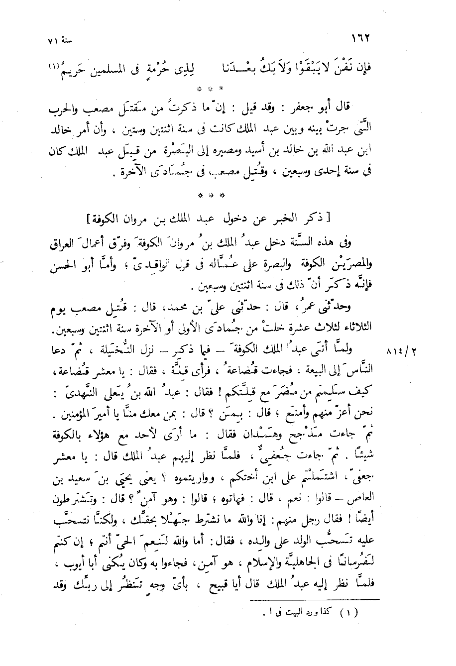 قال أبو جعفر: وقد قيل: إن ما ذكرت من مقتل مصعب والحرب التي جرت بينه وبين عبد الملك كانت في سنة اثنتين وستين، وان امر خالد ابن عبد الله بن خالد بن أسيد ومصيره إلى البصرة من قبل عبد الملك كان في سنة إحدى وسبعين، وقتل مصعب في جمادى الآخرة