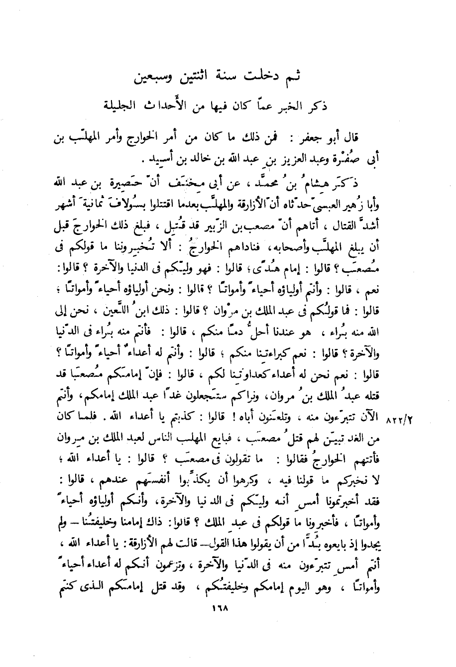 (ذكر الخبر عما كَانَ فِيهَا من الأحداث الجليلة) قال أبو جعفر: فمن ذلك ما كان من امر الخوارج وامر المهلب بن ابى ضفره وعبد العزيز بن عبد الله بن خالد بن أسيد.