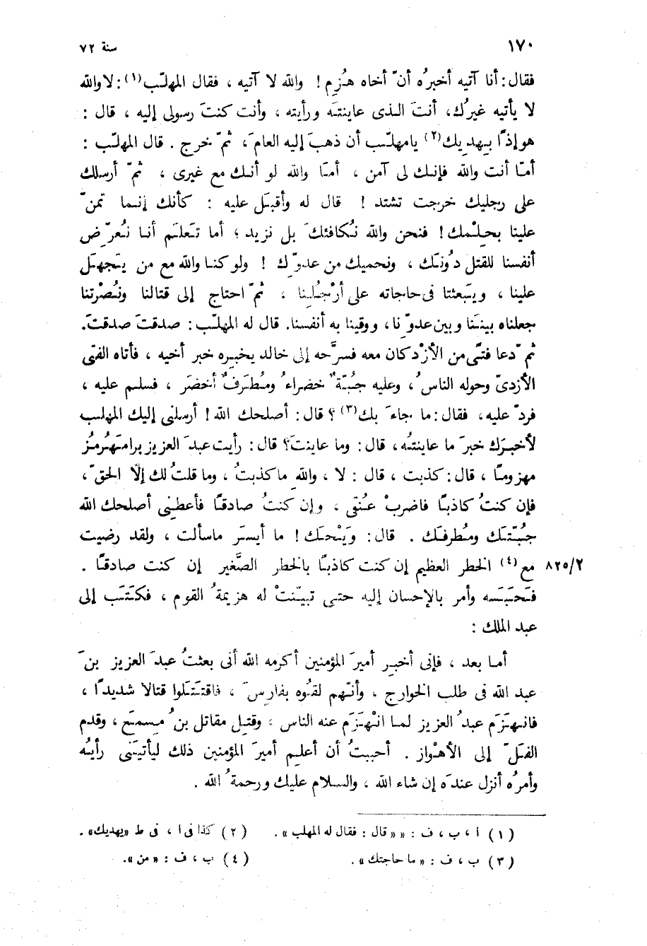 أَمَّا بَعْدُ، فإني أخبر أَمِير الْمُؤْمِنِينَ أكرمه الله أني بعثت عبد العزيز بن عبد الله في طلب الخوارج، وأنهم لقوه بفارس، فاقتتلوا قتالا شديدا، فانهزم عبد العزيز لما انهزم عنه الناس، وقتل مقاتل بن مسمع، وقدم الفل إلى الأهواز أحببت أن أعلم أمير المؤمنين ذلك ليأتيني رأيه وأمره أنزل عنده إن شاء الله، والسلام عليك ورحمة الله